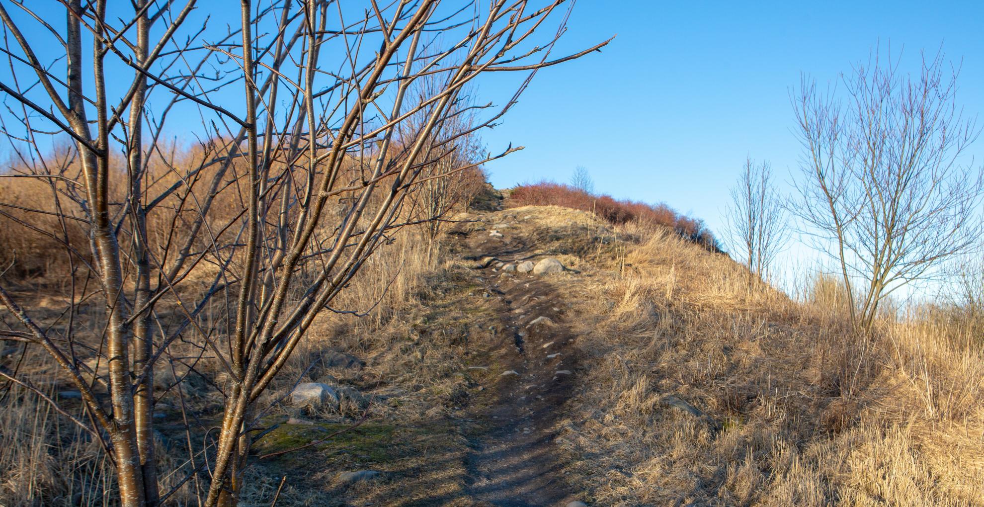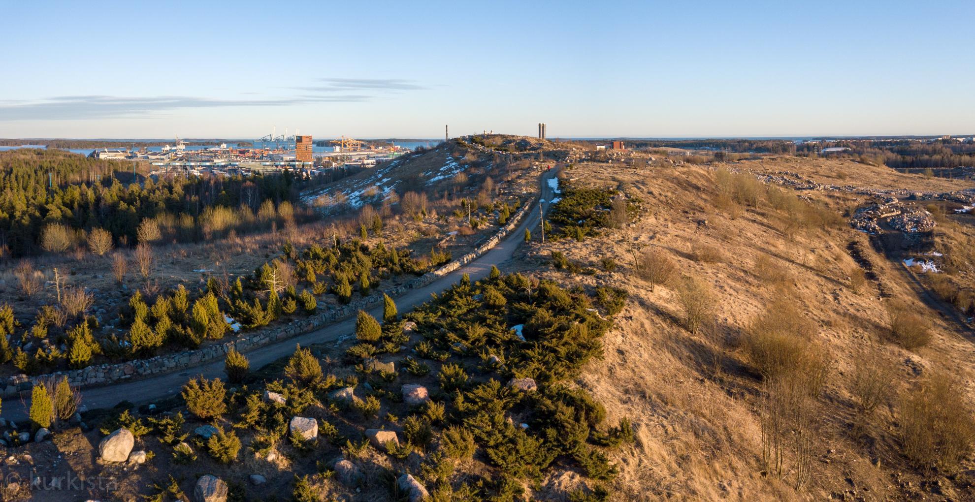 EN: Vuosaari landfill hill is a man-made recreational area in north Vuosaari. The former dump and landfill area has become an open natural area where domestic plants grow naturally in meadowy and rocky conditions. Since its 60 metres in height, there's also a viewing point with a magnificent view over the surrounding area and eg. the Vuosaari harbour.