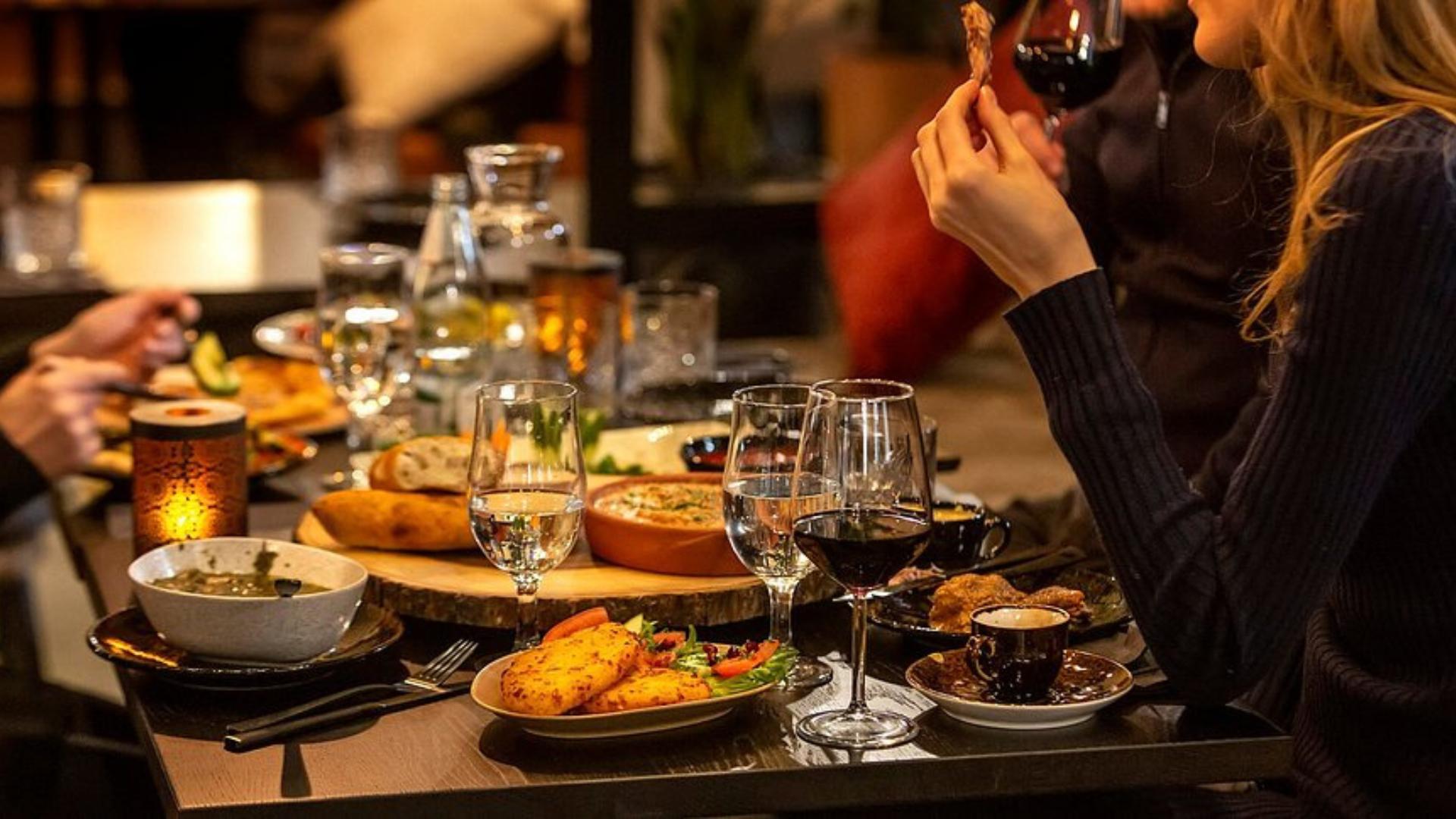 FI: Ihmiset georgialaisen ruoan äärellä tunnelmallisessa ravintola Rionissa.