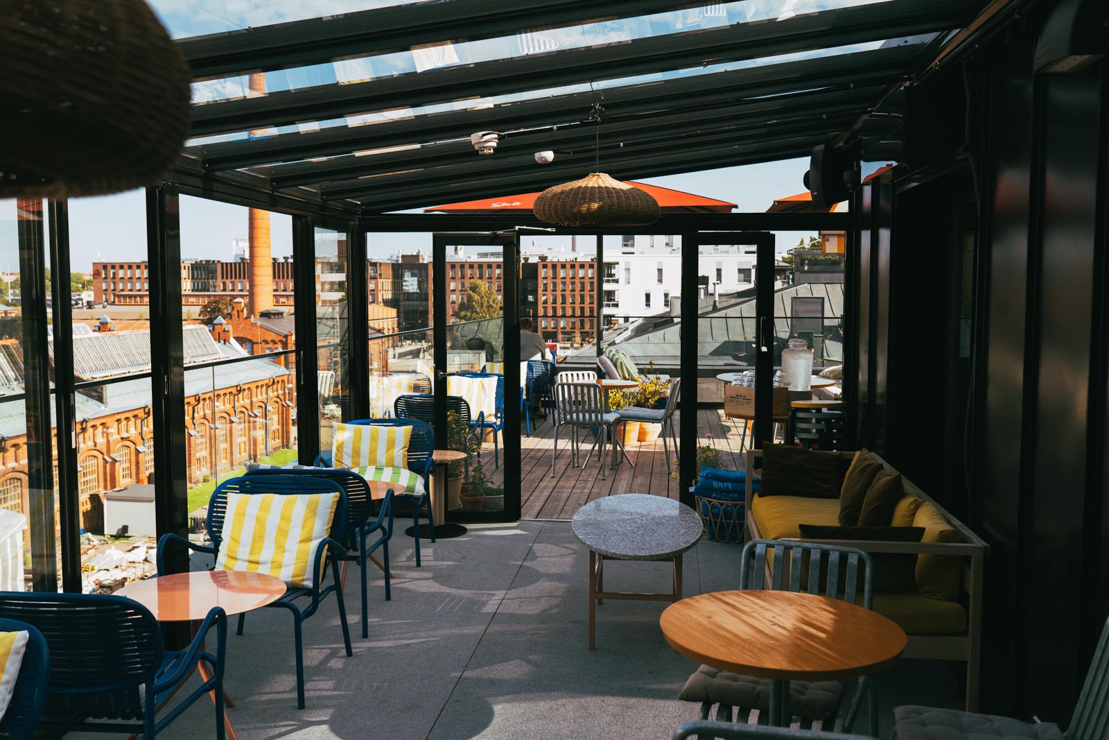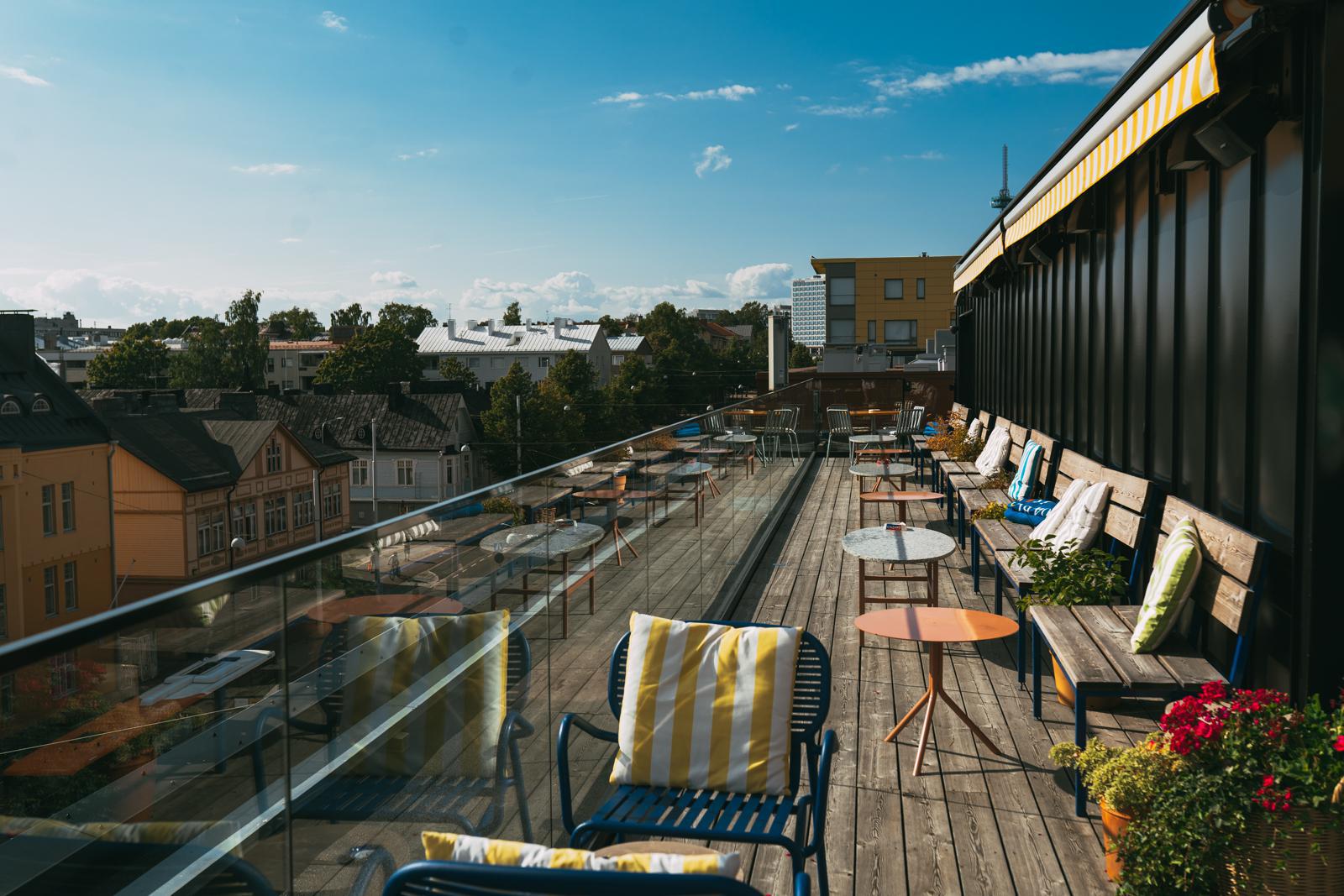 FI: Alexis kattobaari, jossa on tuoleja ja pöytiä, sekä taustalla kaupunkimaisema.