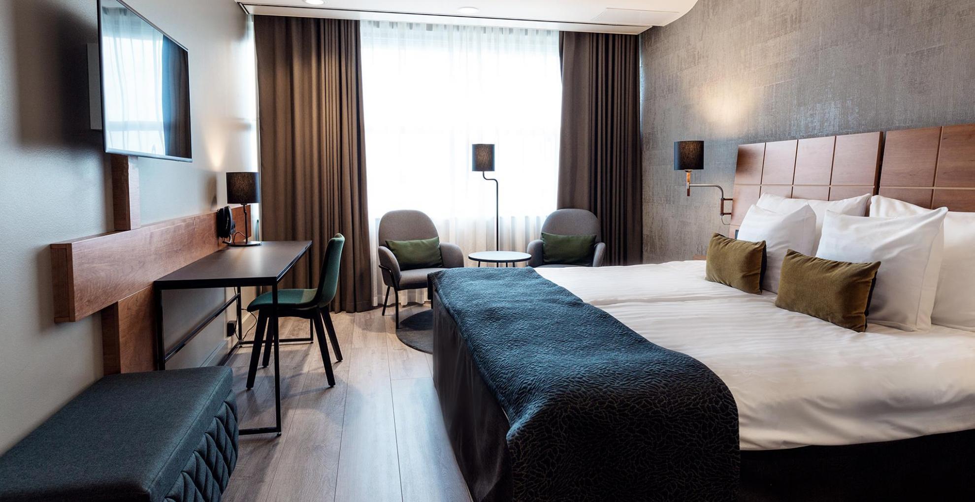SV: Scandic Simonkenttäs hotellrum, en säng och möbler.