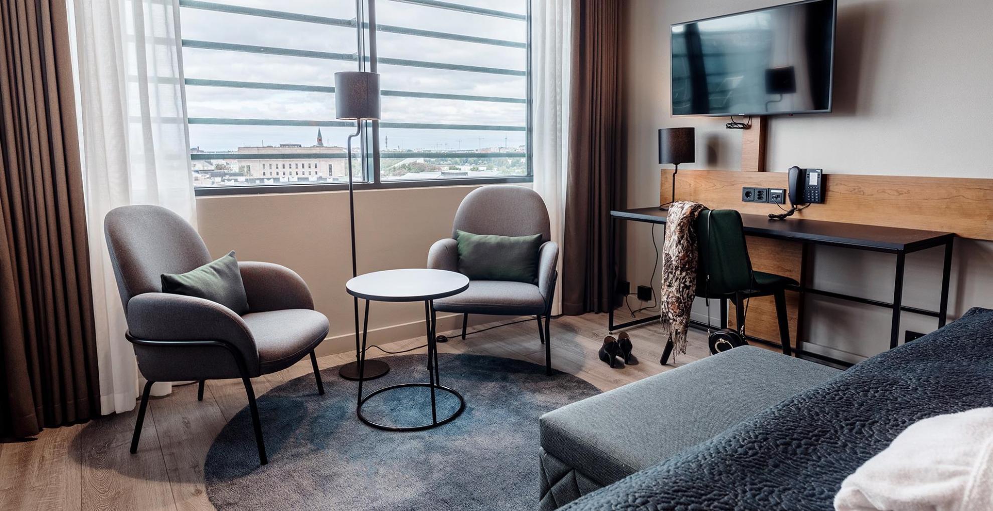 SV: Scandic Simonkenttäs hotellrum, ett bord och stolar framför fönstret.