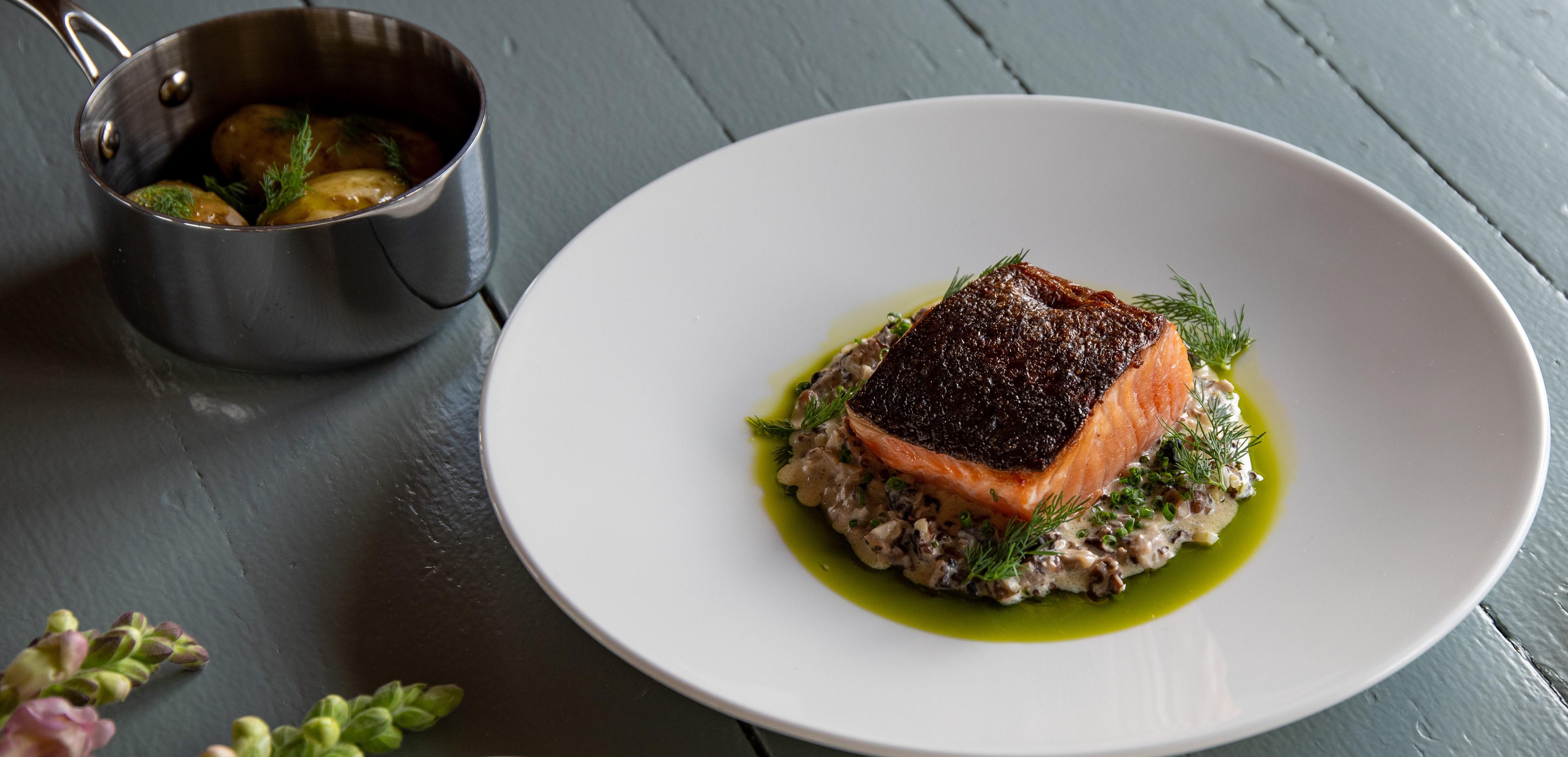 FI: Ravintola Särkänlinnan ruoka-annos valkoisella lautasella.