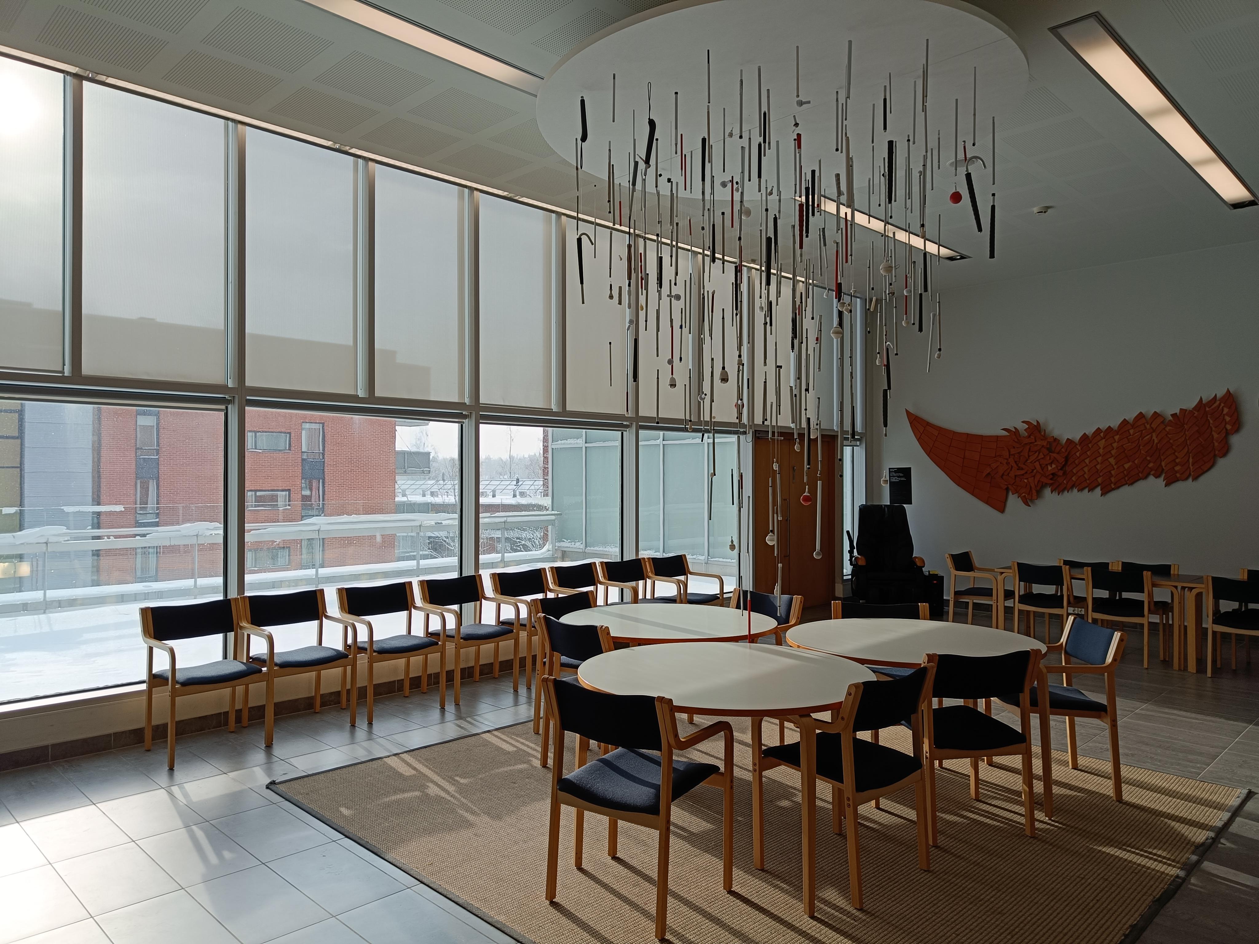 EN: Iiris Centre's lobby area. On the photo, there are round tables, chairs, and windows.
