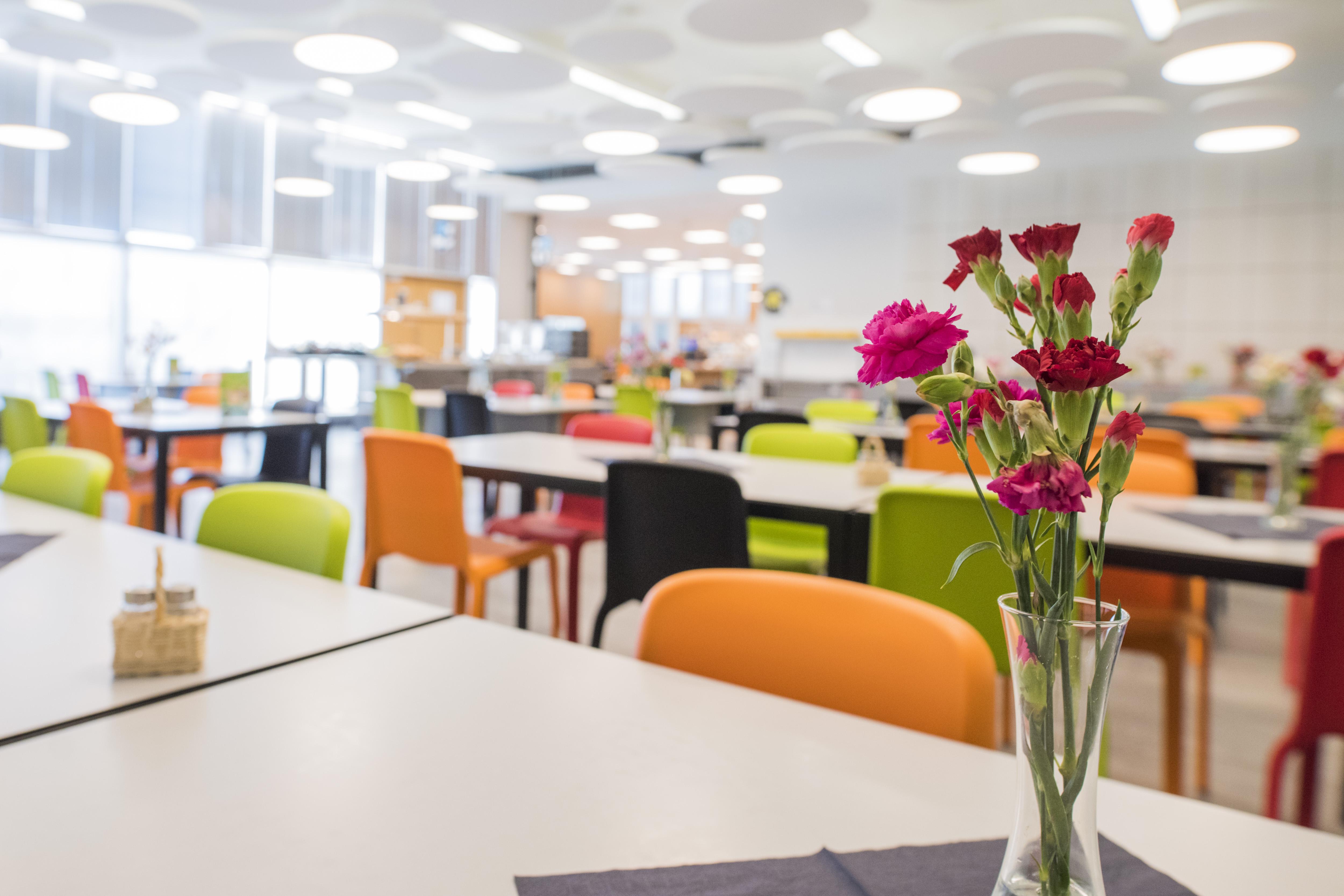EN: Iiris Centre's dining area. On the photo, there are tables, colourful chairs, and flowers on the tables.