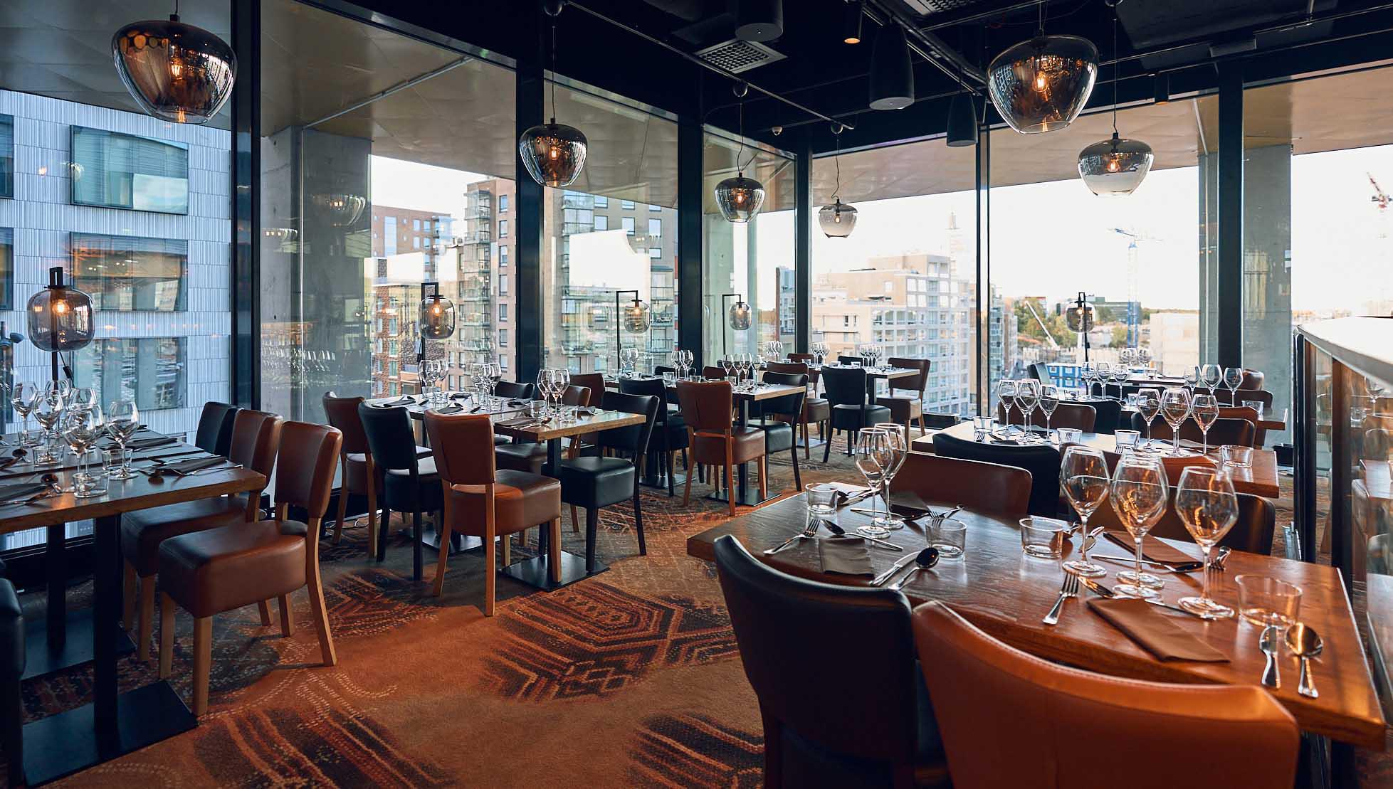 FI: The Towerin kolmas kerros. Ravintolasalissa on katettuja pöytiä, ja ikkunoista on näkymät ulospäin.