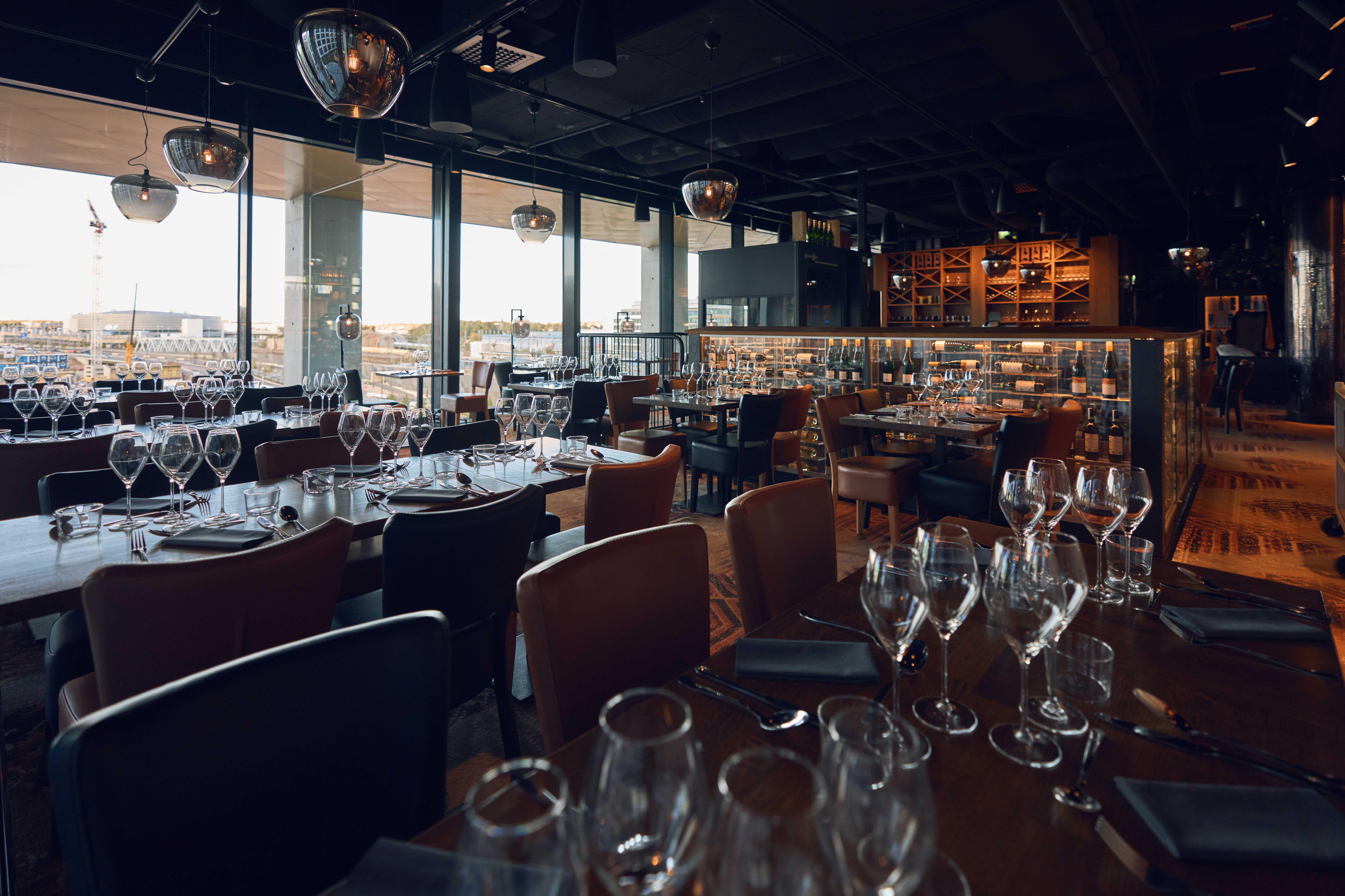 FI: Towerin kolmas kerros. Ravintolasalissa on katettuja pöytiä, ja ikkunoista on näkymät ulospäin.
