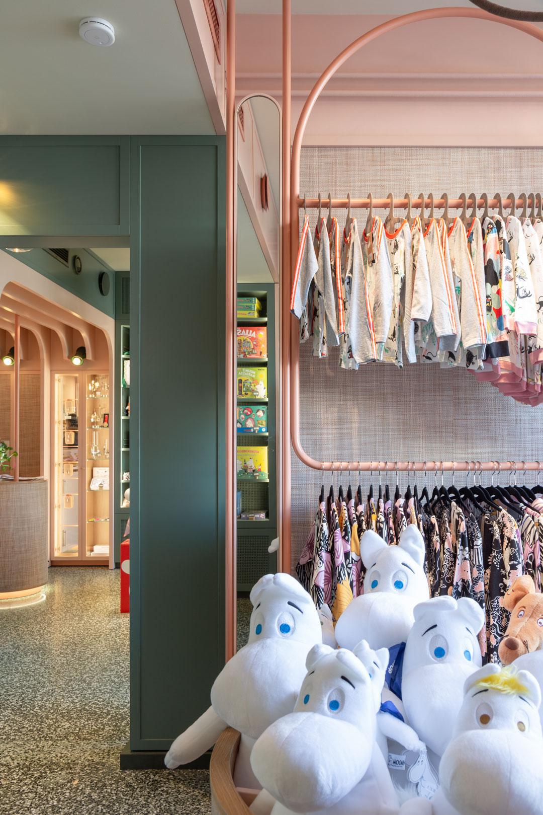 FI: Moomin Shop Lasipalatsin sisätilat. Myymälän tuotteita esillä.