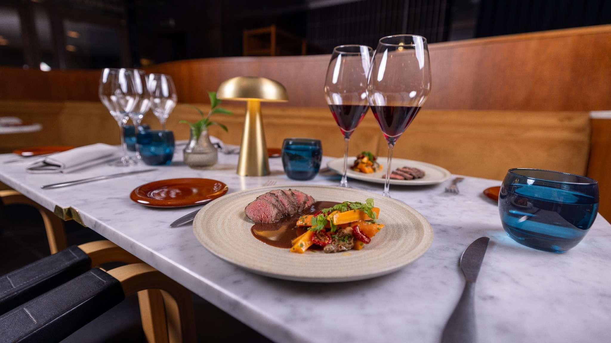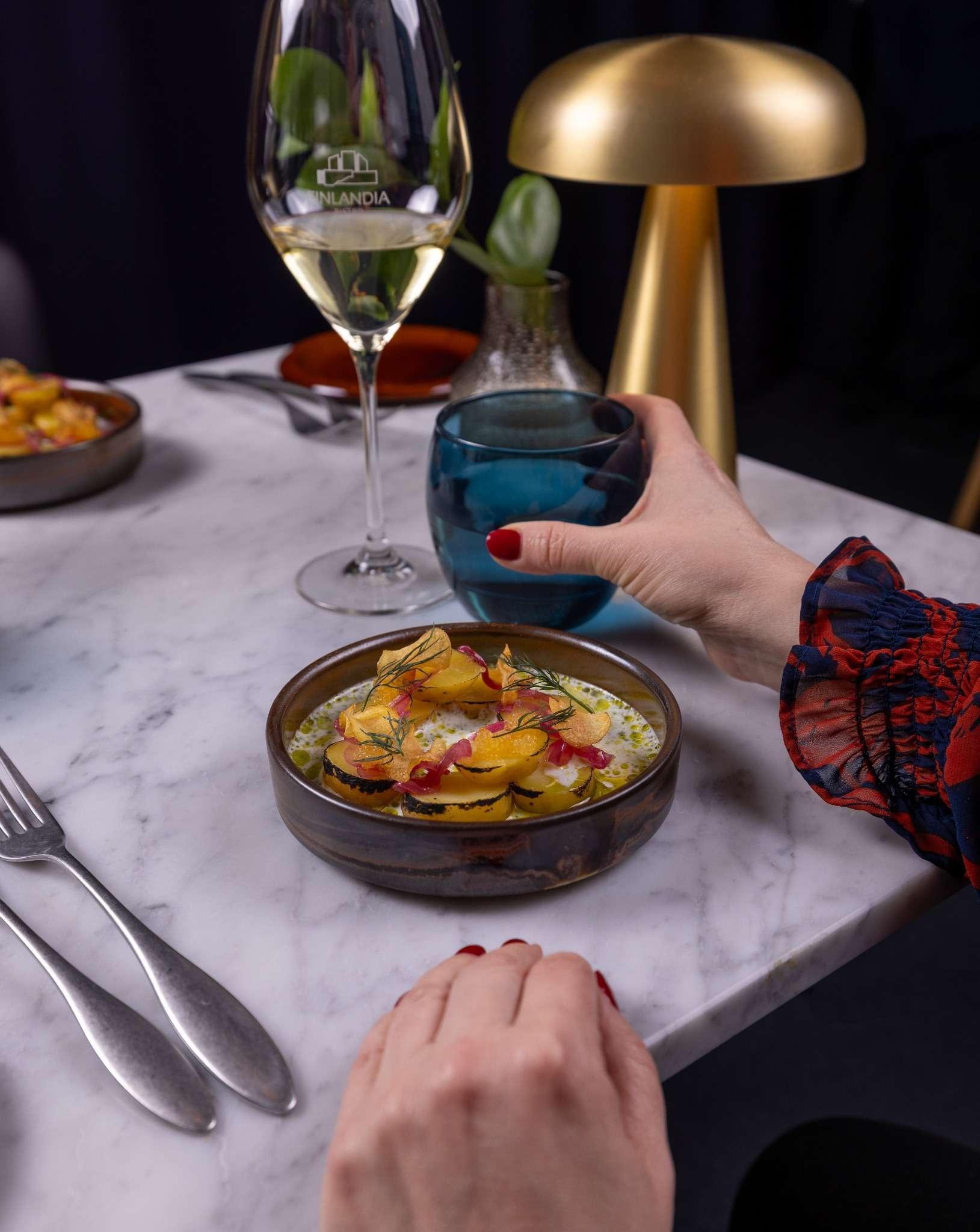 FI: Finlandia Bistron sisätilat. Kuvassa näkyy pöytä, jossa on ruoka-annoksia ja juomalasi.