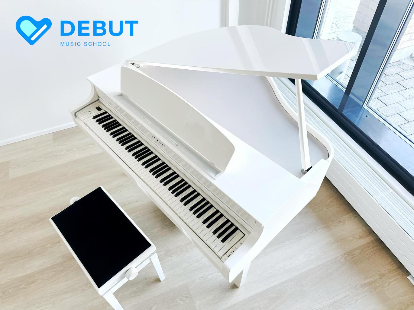 FI: Näkymä Debut Music Schoolin studiosta valkoisen flyygelin kanssa