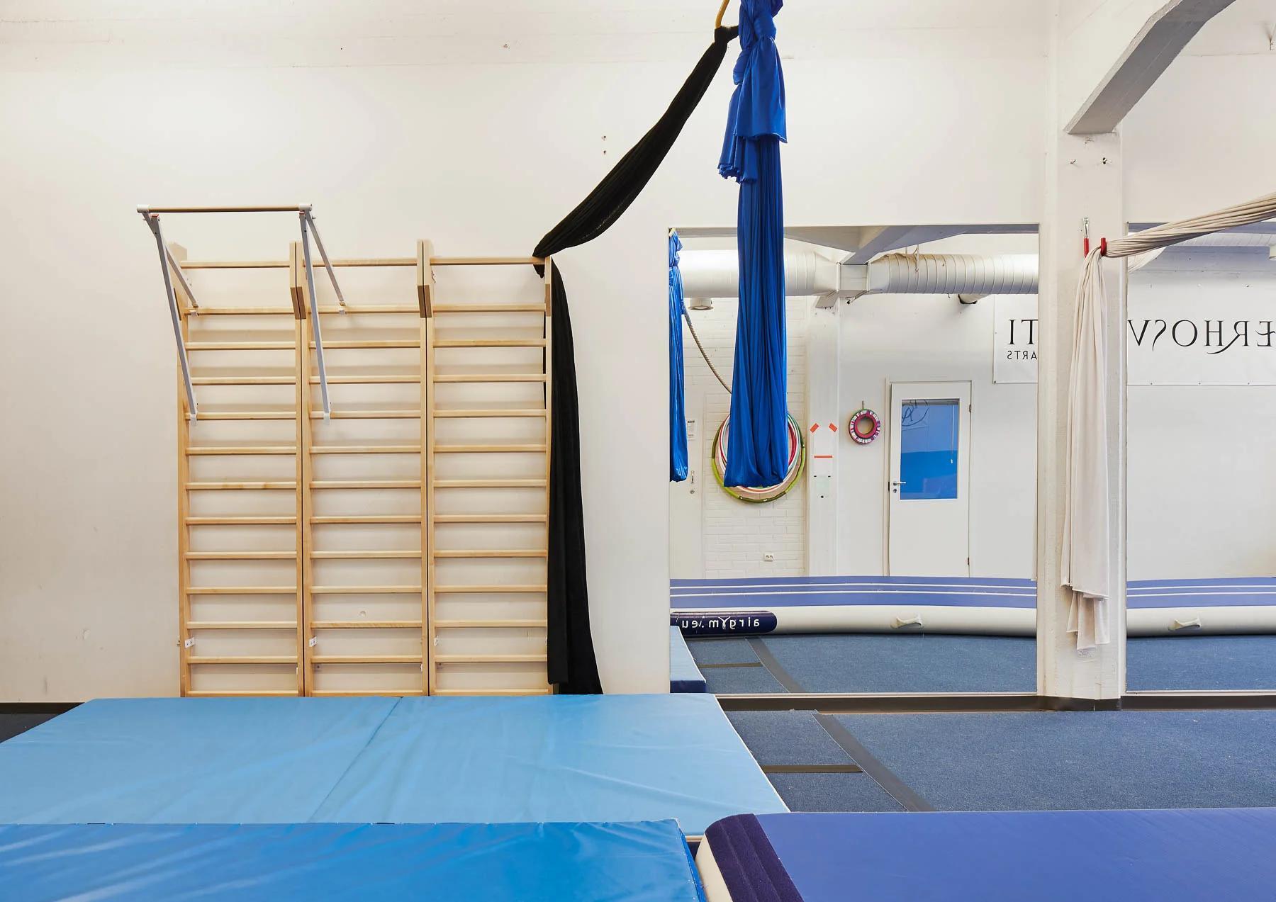 EN: A circus studio with stall bars, blue aerial silks, and gymnastics mats reflected in a large mirror.