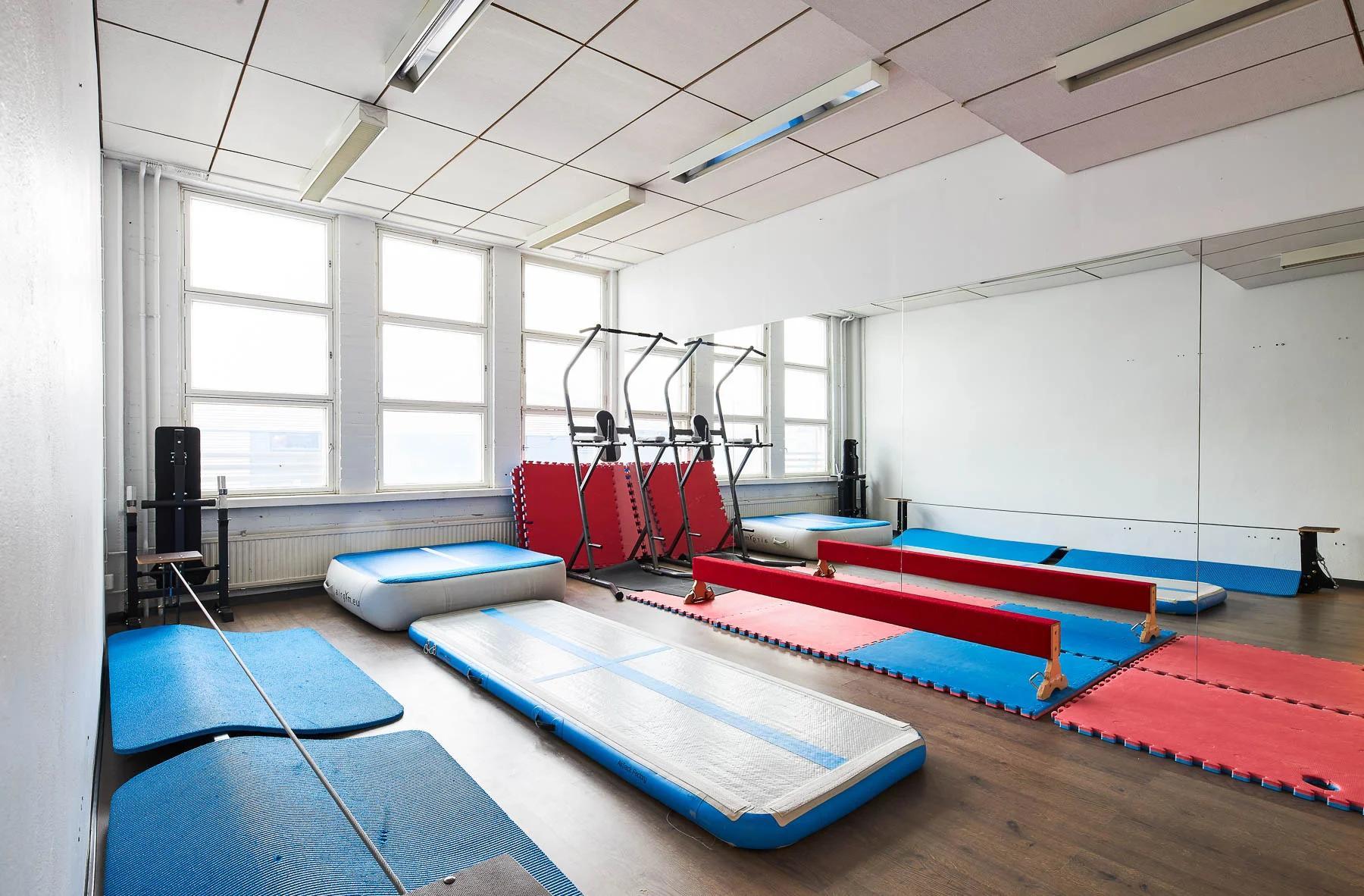 FI: Sirkussali, jossa on puolapuut, siniset ilma-akrobatiakankaat ja voimistelumattoja suuren peilin edessä.