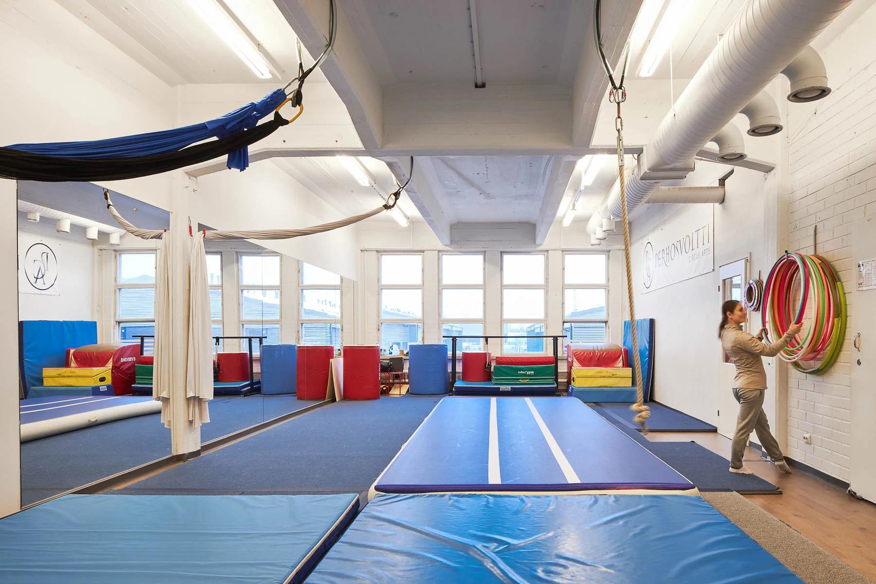 EN: Perhosvoltti Acrobatics and Circus Arts is a specialist circus acrobatics school in Helsinki's Suutarila district, founded in 2013 by professional circus artist Olia Vahtola. With over 30 years of international performance and training experience — including studies in France, Sweden, and Ukraine — Olia brings world-class expertise to every class.