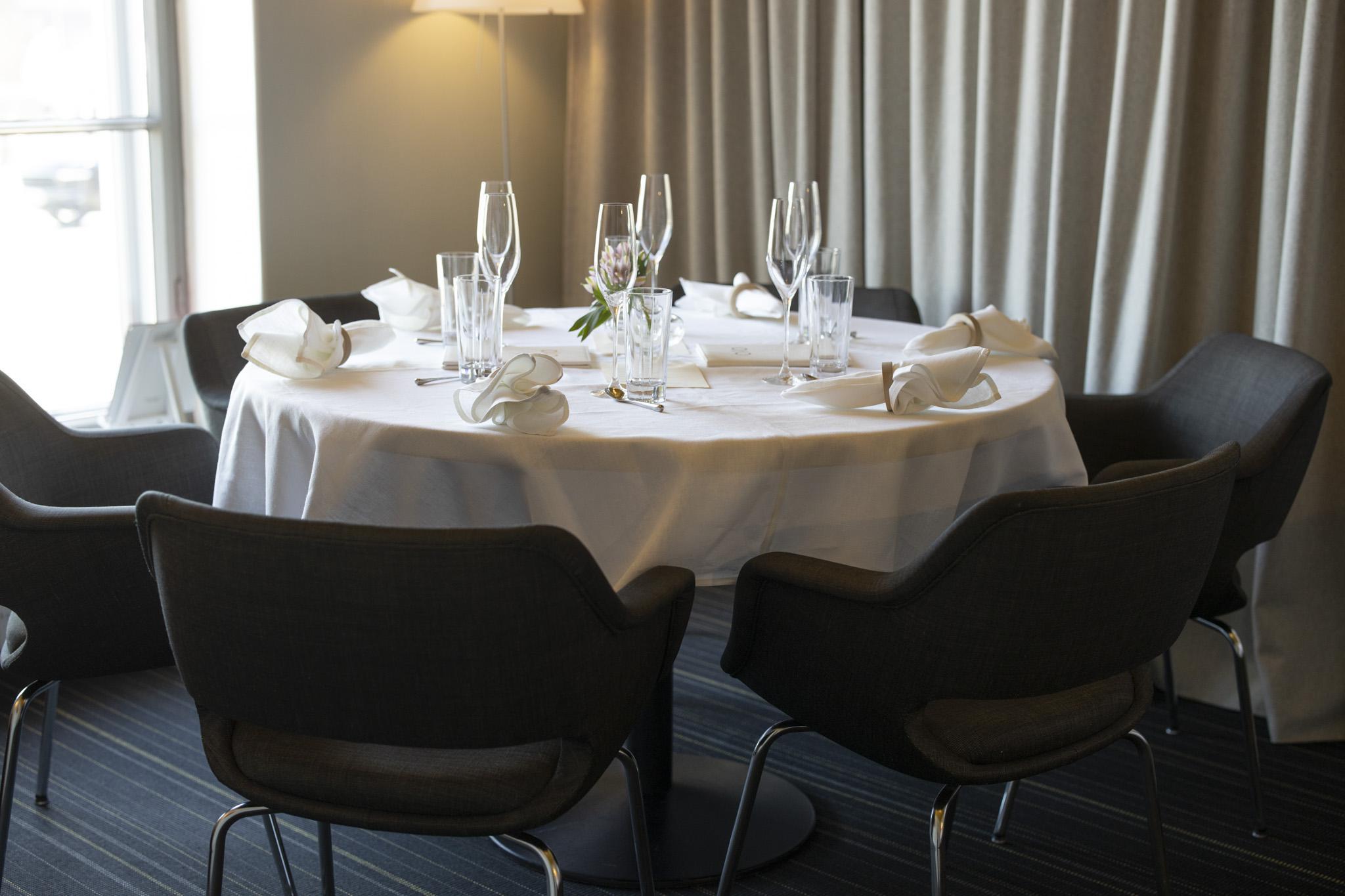 SV: Ett dukat bord med vit duk och glas i Restaurang Olo.