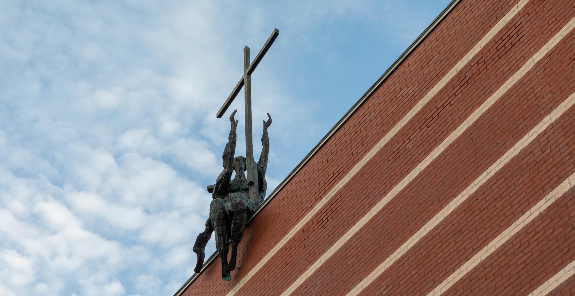 EN: Near Kontula shopping centre, on the edge of the St. Michael"s church roof sits the Archangel Michael in his flowing robes, worshipping the cross. The red brick St. Michael's church was designed by architects, Käpy and Simo Paavilainen. The church was build on the same location as the temporary Kontula church of Heikki and Kaija Sirén from the 1960s, which was demolished in 1986. On the roof is the five metre high Ristin tie (Via Crucis), the work of sculptor, Kari Juva. The character in flowing clothes is the leader of the heavenly army, archangel Michael, after whom the church is named. Many also see in the sculpture a man leaning on the cross.
