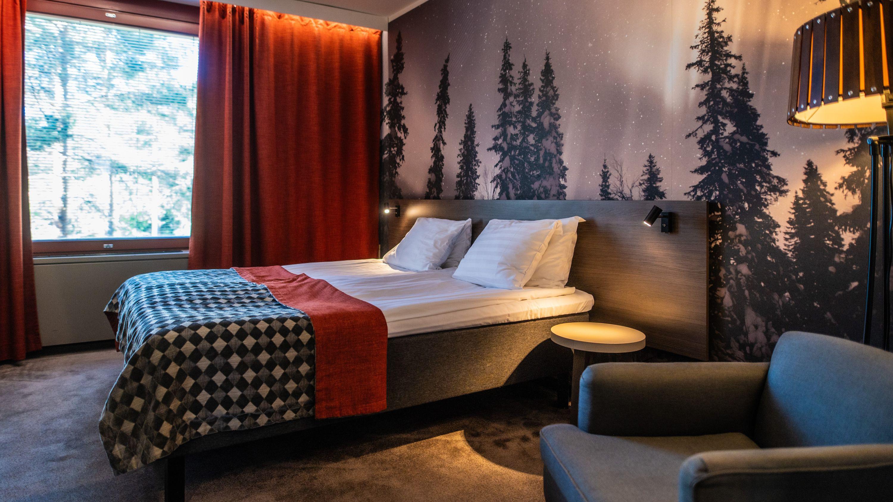 FI: Hotelli Korpilammen hotellihuone, jossa näkyy sänky, tuoli ja ikkuna.