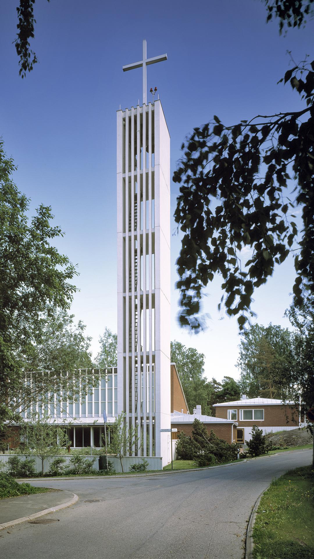 FI: Valmistunut vuonna 1960. Lentoliikenteen takia valaistun kellotapulin ristin vuoksi sitä on kutsuttu myös Palavan ristin kirkoksi.