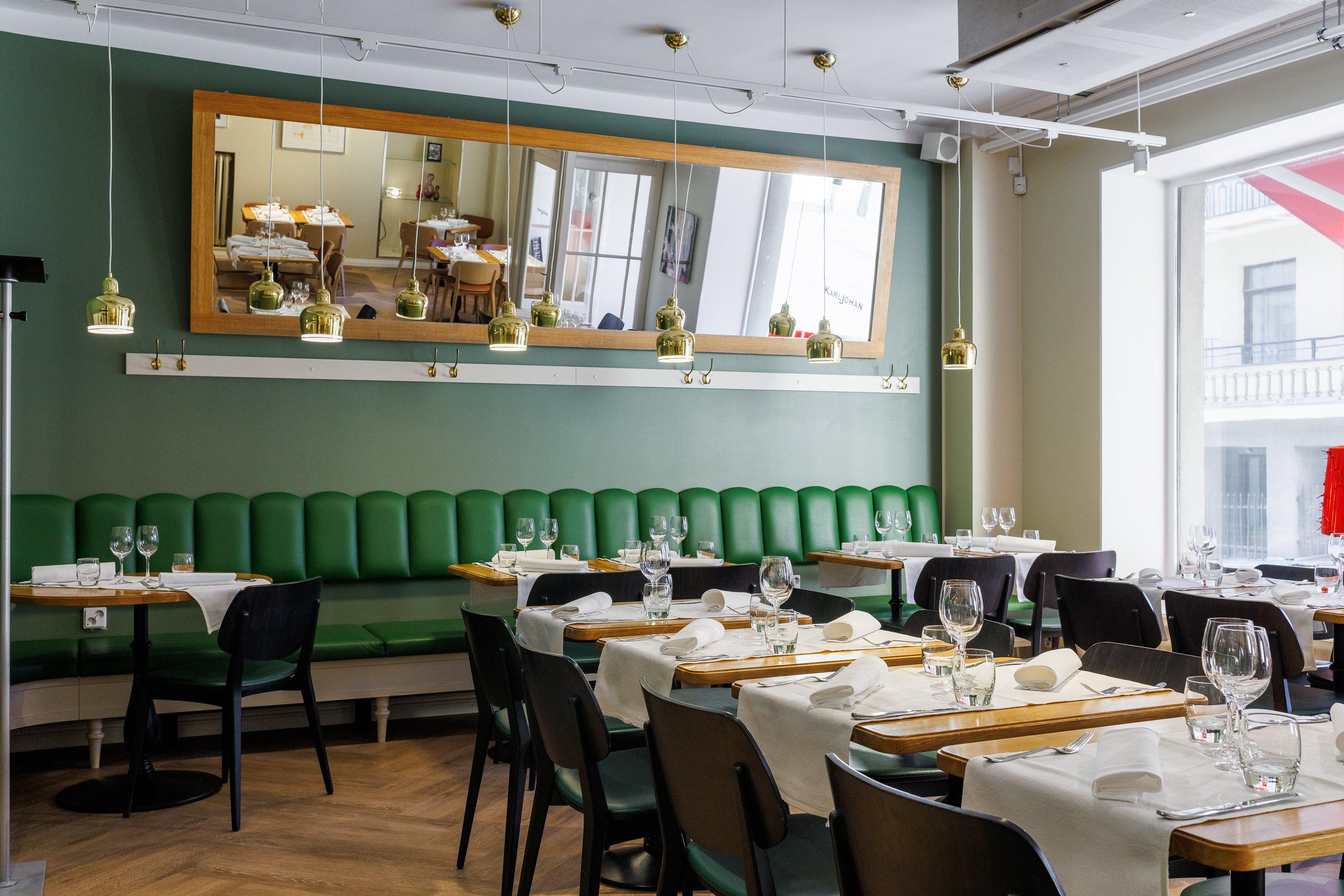 SV: Restaurang Karl Johans inomhusutrymmen. Dukade bord och en spegel på väggen.