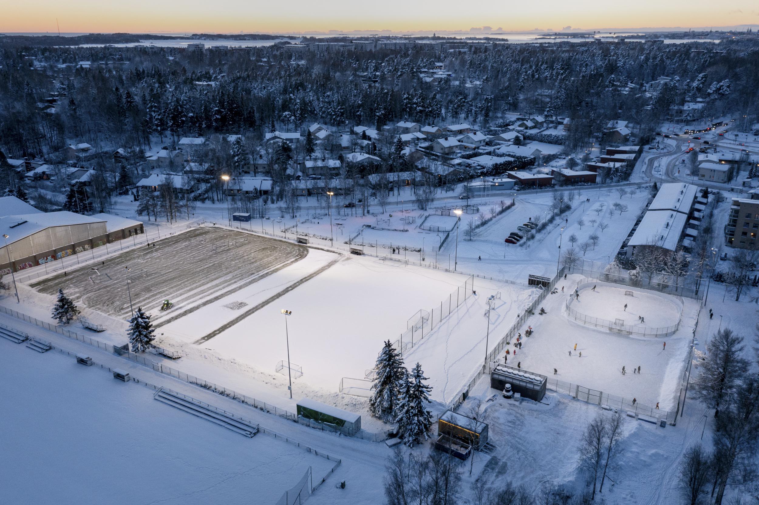 FI: Laajasalon liikuntapuisto talvella kuvattuna yläilmoista.