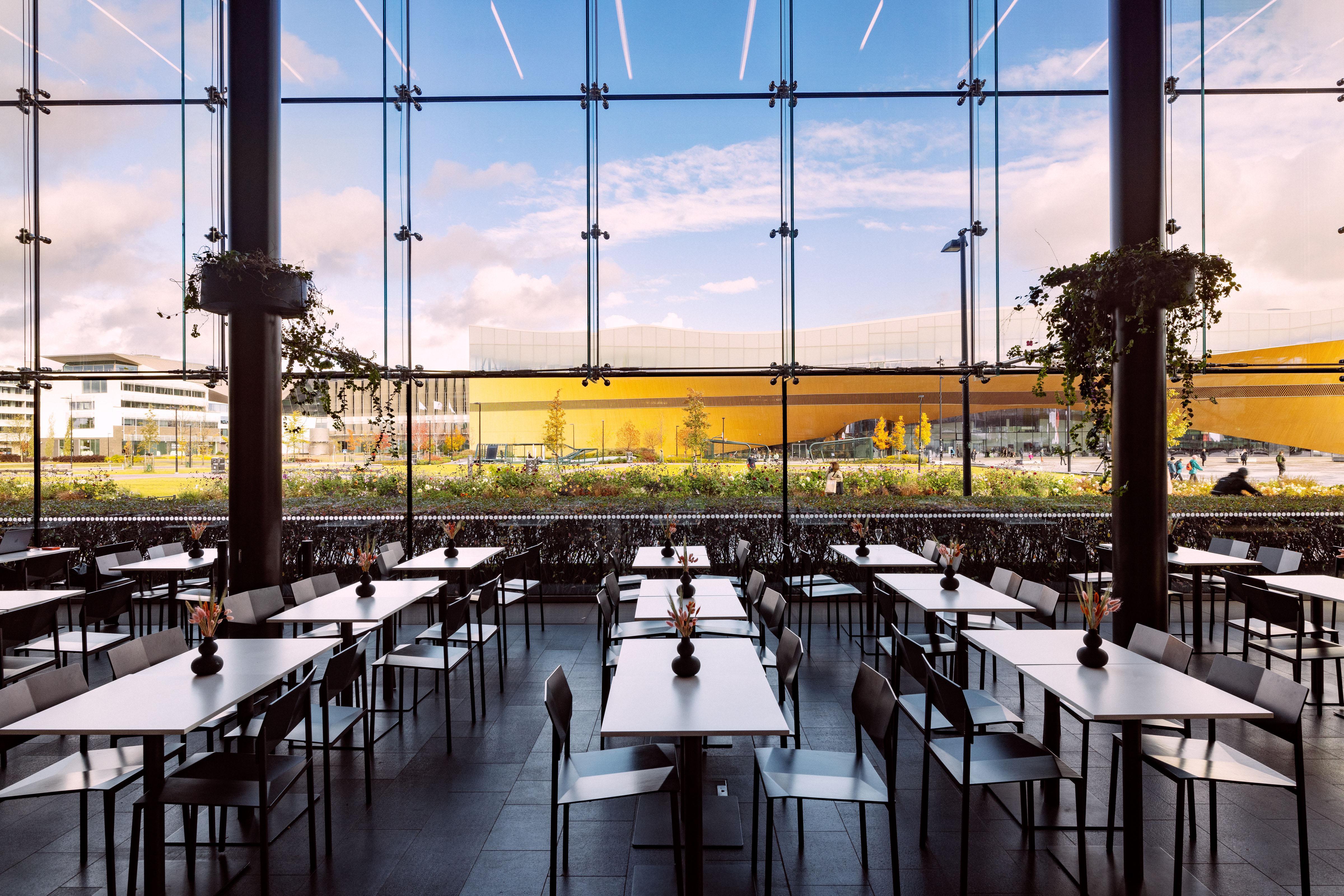 EN: Musiikkitalo Café, view from the inside. Tables and chairs, and in the background big windows.