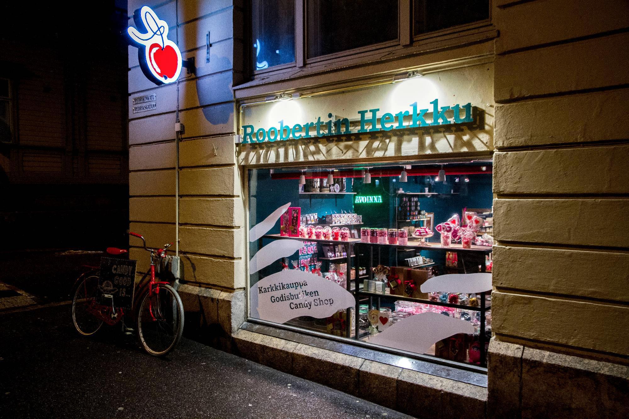 FI: Roobertin Herkku on perinteikäs karkkikauppa Punavuoren Viiskulmassa jossa on sadoittain irtokarkkeja, erikoisuuksia sekä sesongin makeisia.