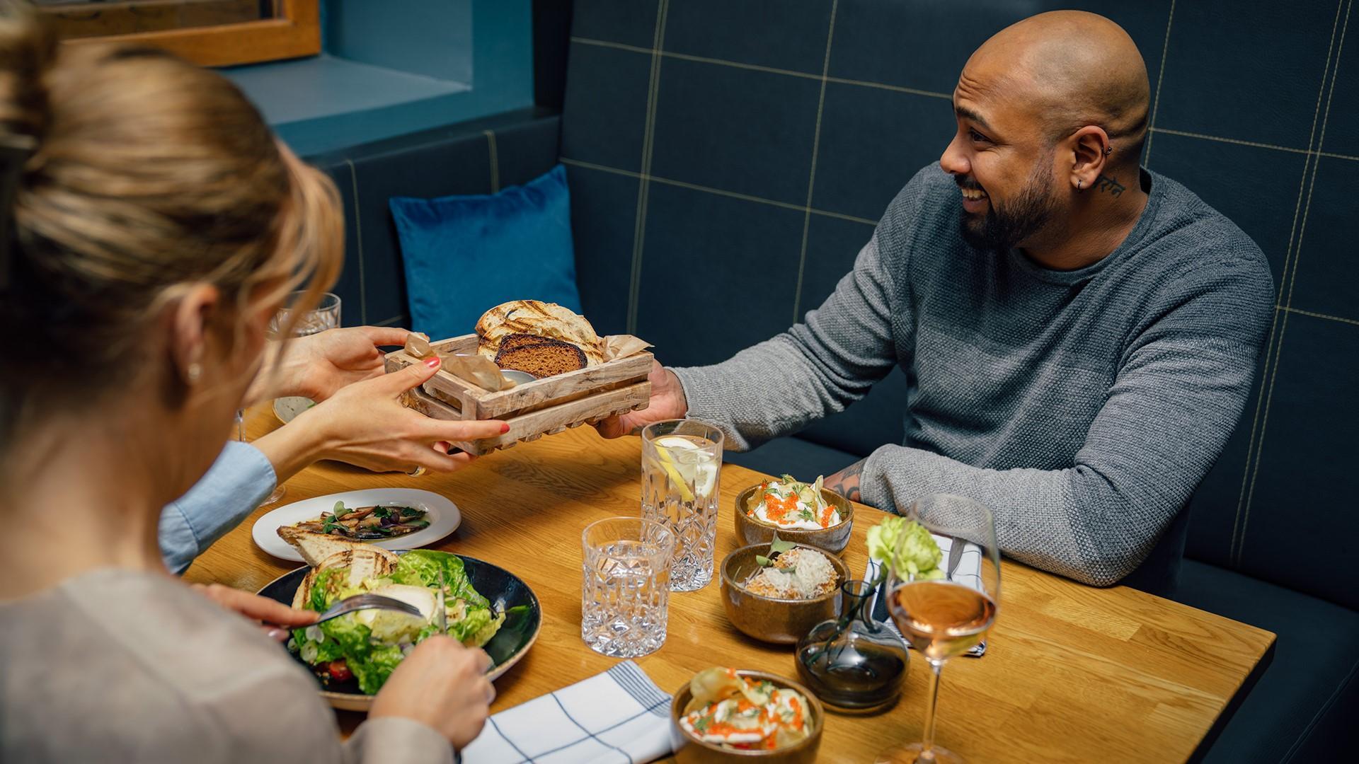 FI: Bistro Gimis, henkilöitä pöydän äärellä, jossa on ruoka-annoksia ja juomia.