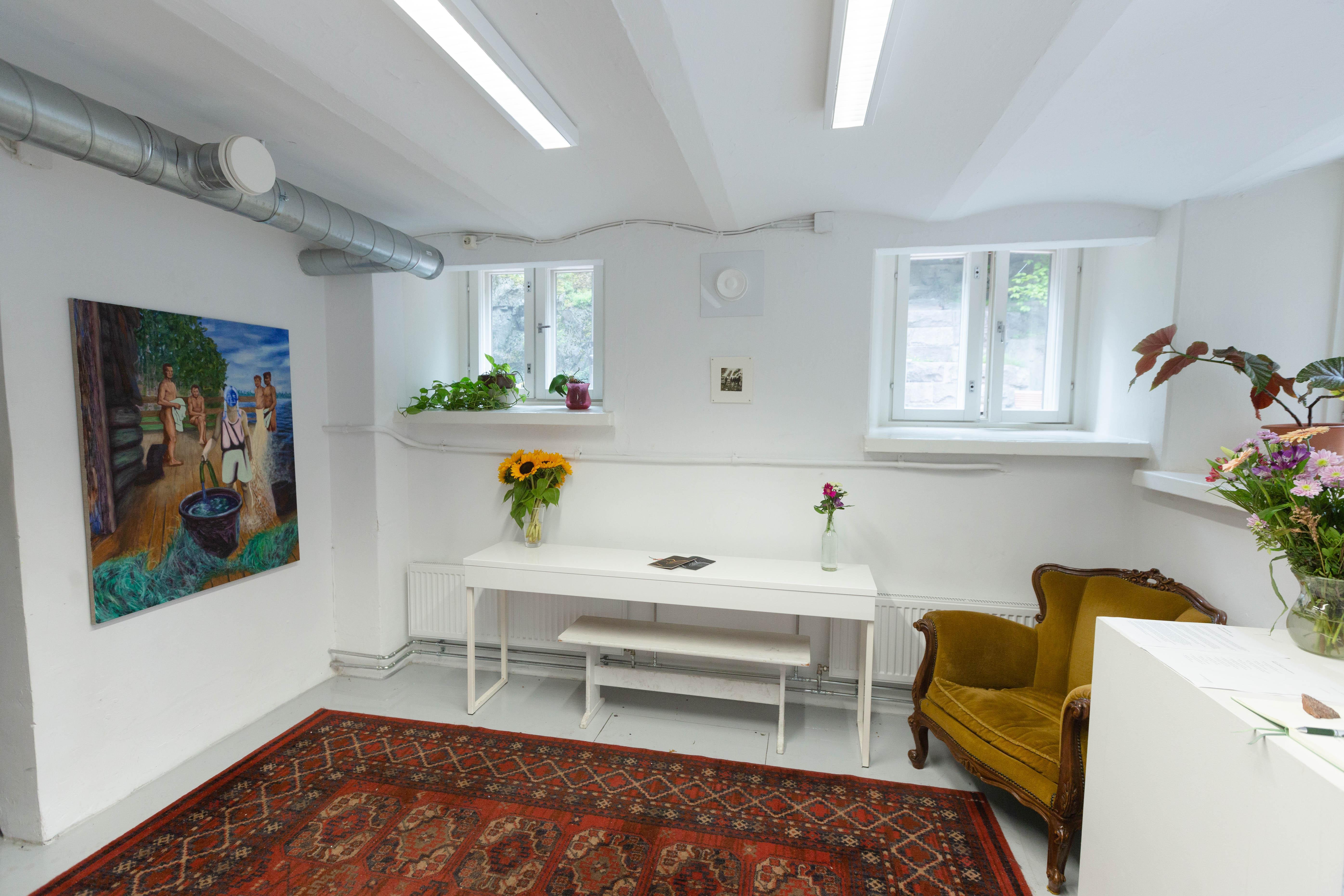 SV: Asbestos Art Space inifrån sett. I utrymmet finns en matta, ett vitt bord och en vit hylla. Bredvid hyllan står en mörk soffa. På väggen hänger en målning.