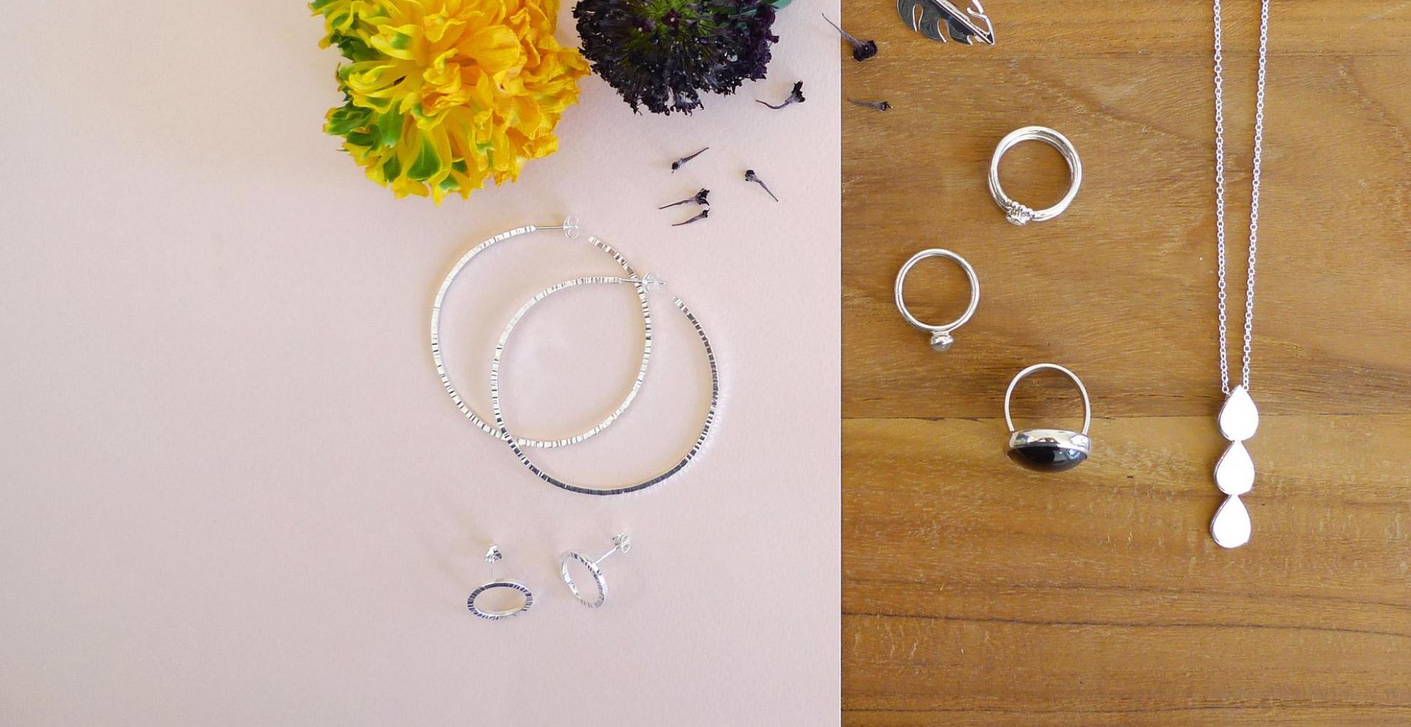 EN: Silver earrings, rings and necklace.