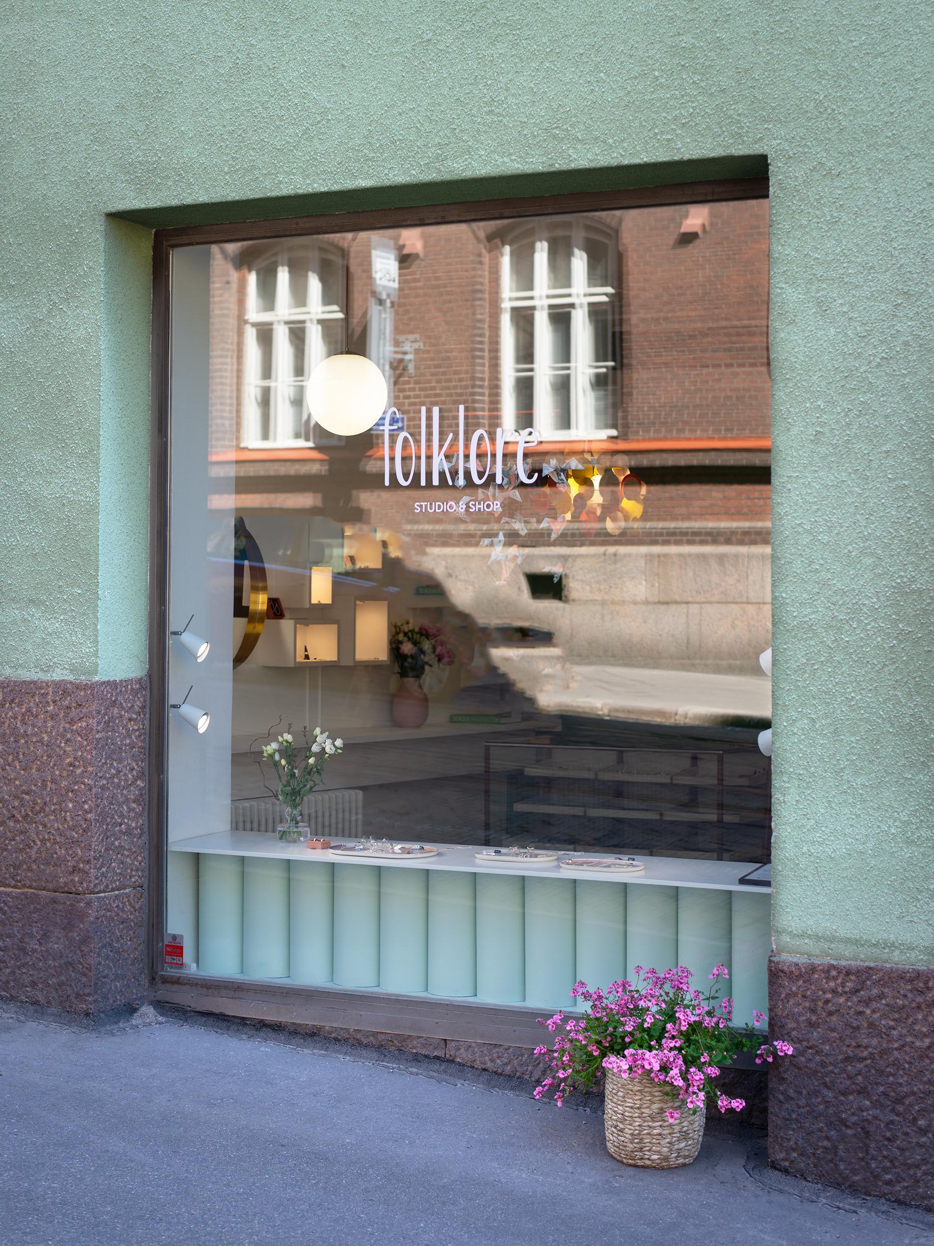 FI: Folklore Studion näyteikkuna kadulta katsottuna.