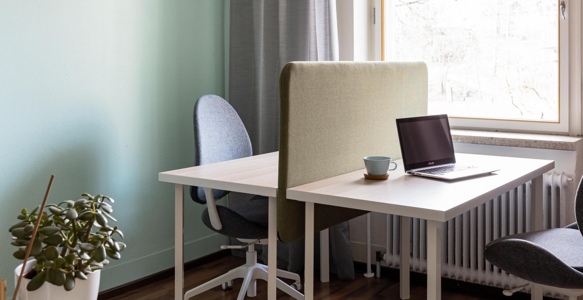 FI: Kotoisa coworking-tila. Hiljainen huone hiljaiseen työskentelyyn. Mesta Coworking Herttoniemi.