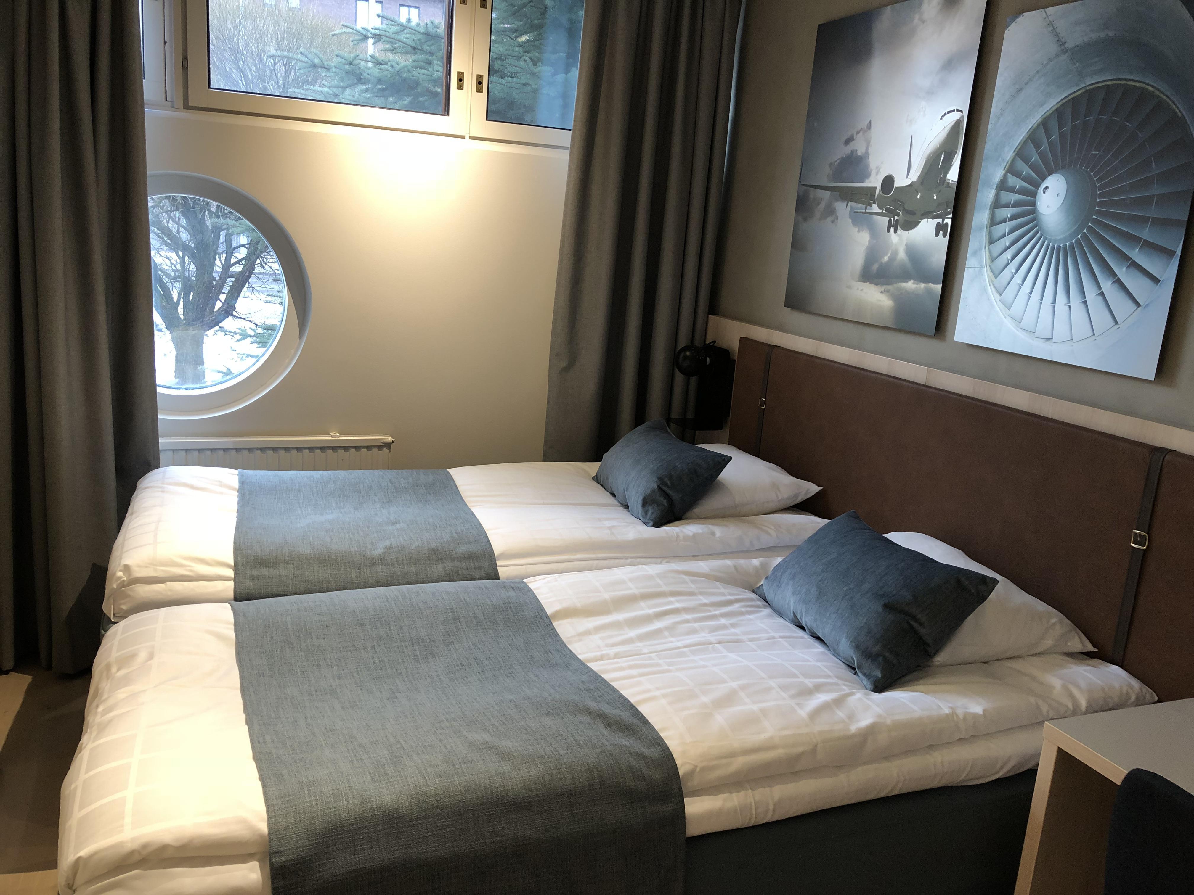 SV: Standard Twin-rum i Pilot Airport Hotel. En säng, i bakgrunden ett rundformat fönster.