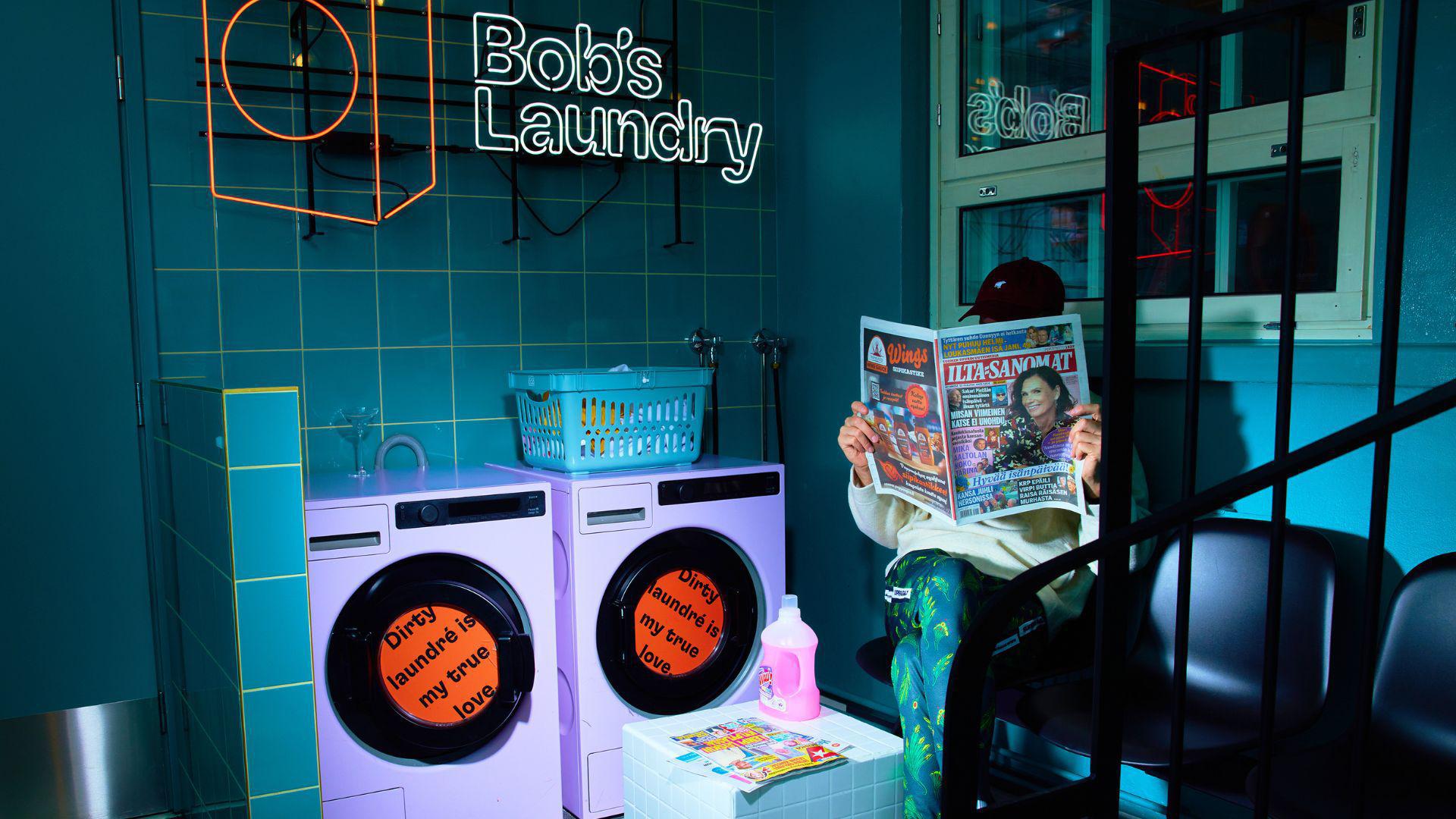FI: Bob's Laundryn sisätilat. Henkilö istuu sanomalehti kädessä kahden pesukoneen vieressä.