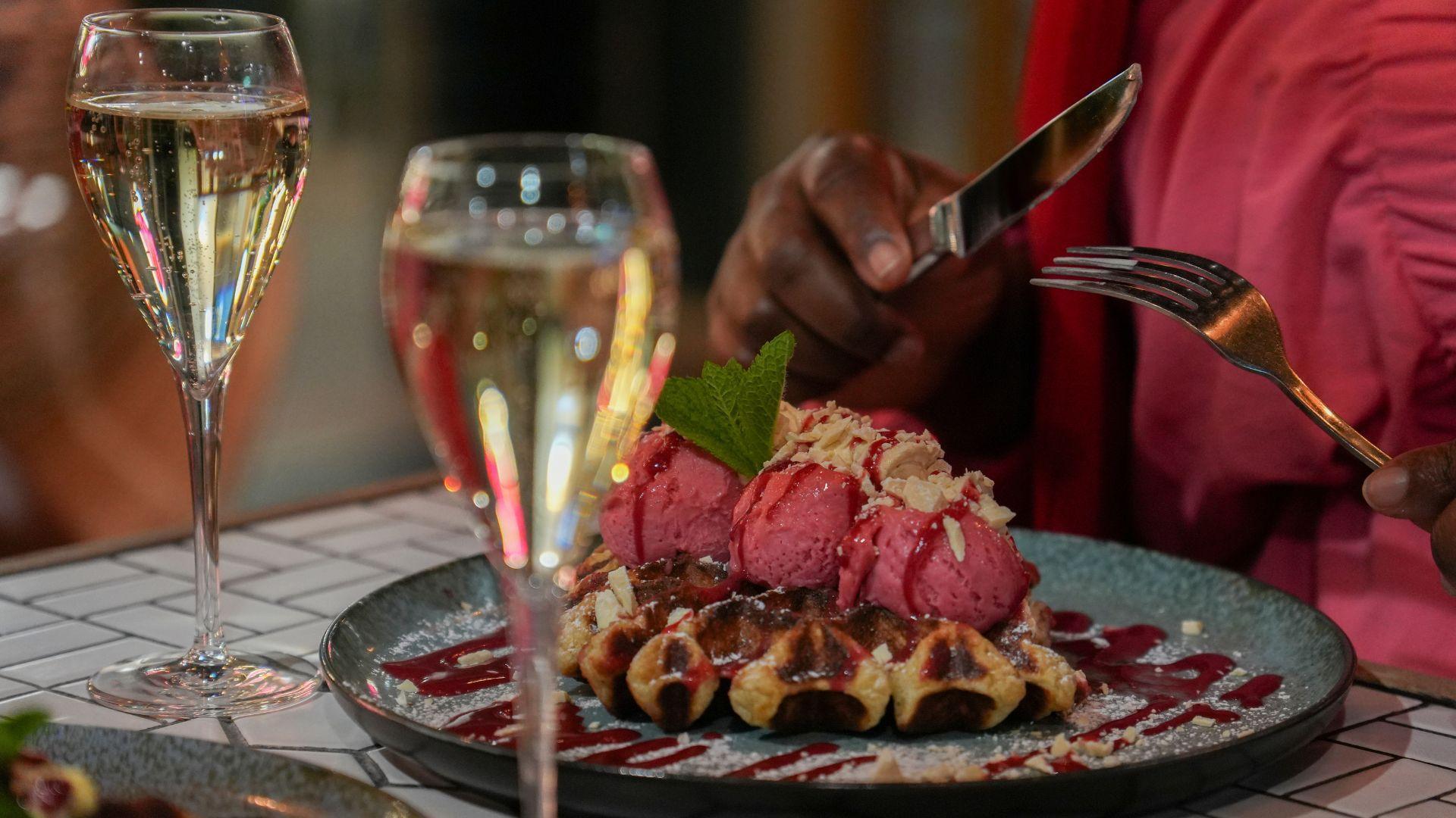 EN: Raspberry–white chocolate waffle and a glass of sparkling wine.