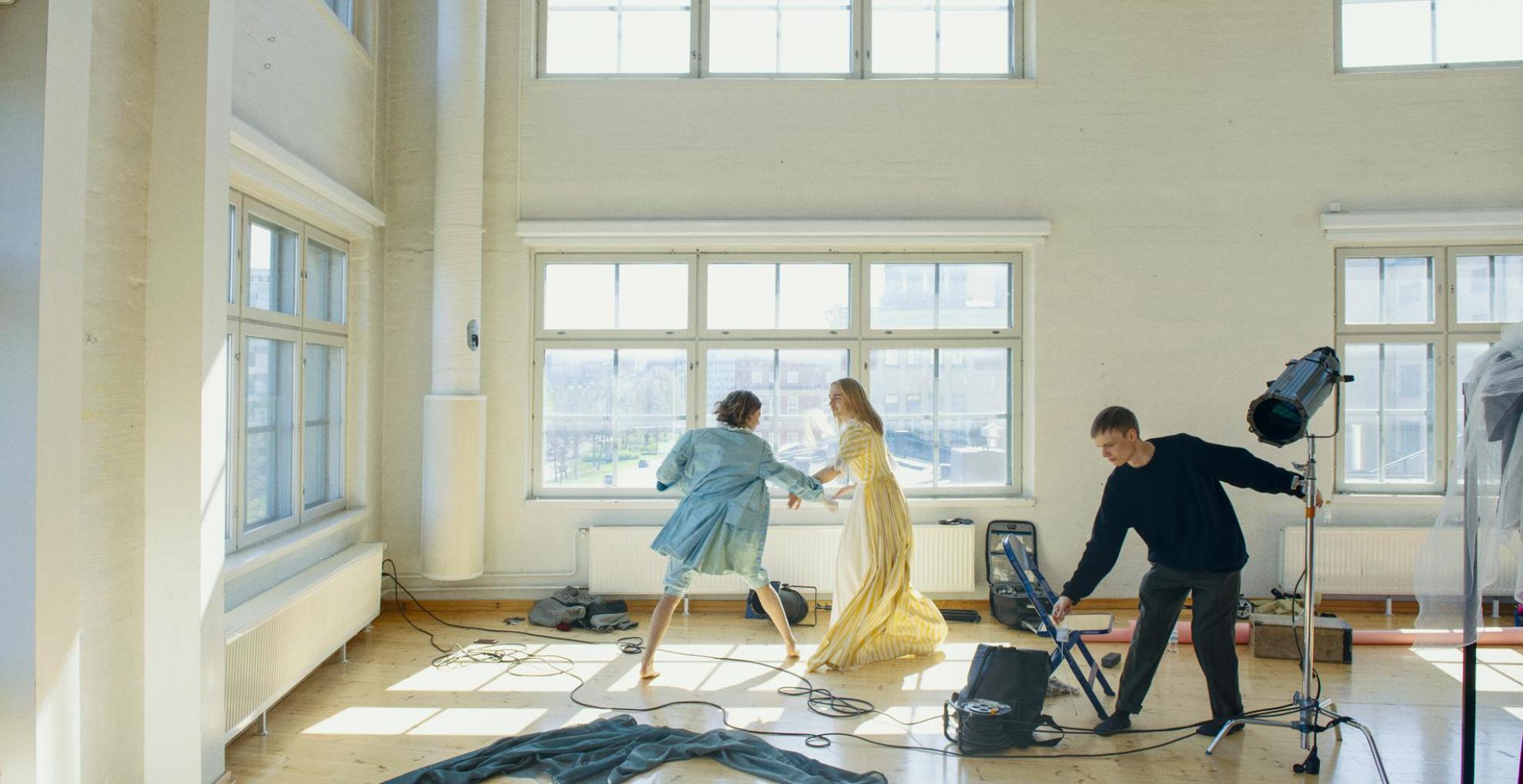 EN: Two students in costumes acting out a scene in a rehearsal room flooded with daylight. Next to them is a light technician.
