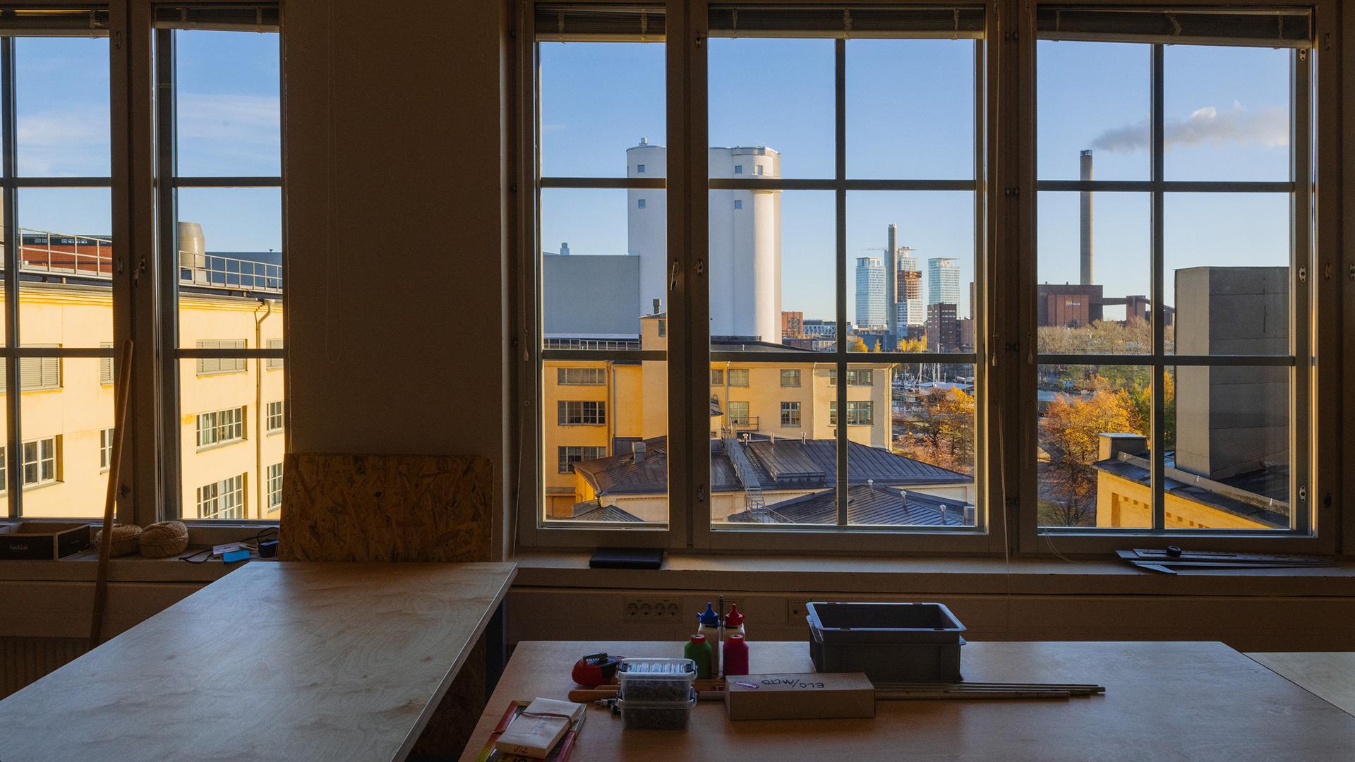 FI: Näkymä Teatterikorkeakoulun harjoittelutilan isoista ikkunoista. Ikkunoista näkyy naapuritontin Myllyn viljasiilo.