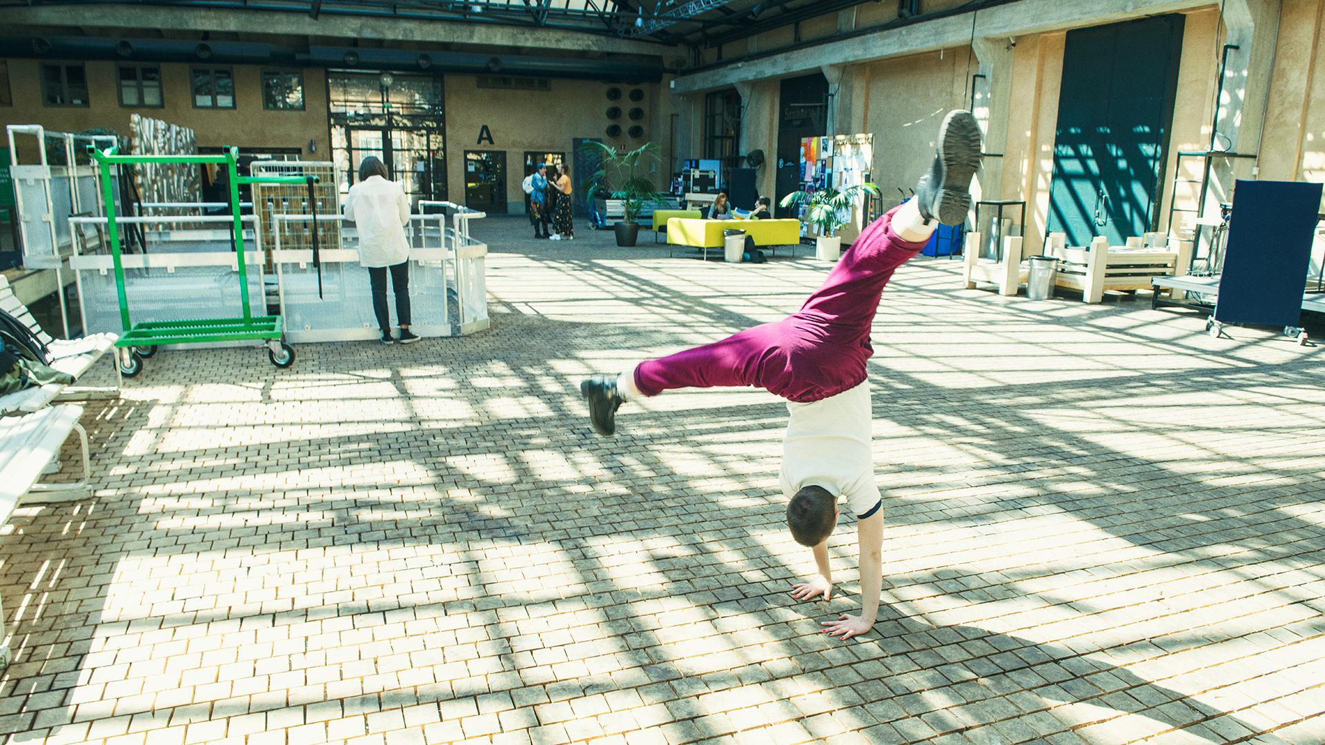 EN: A student doing a cartwheel in the large hall of Uniarts Helsinki's Theatre Academy.
