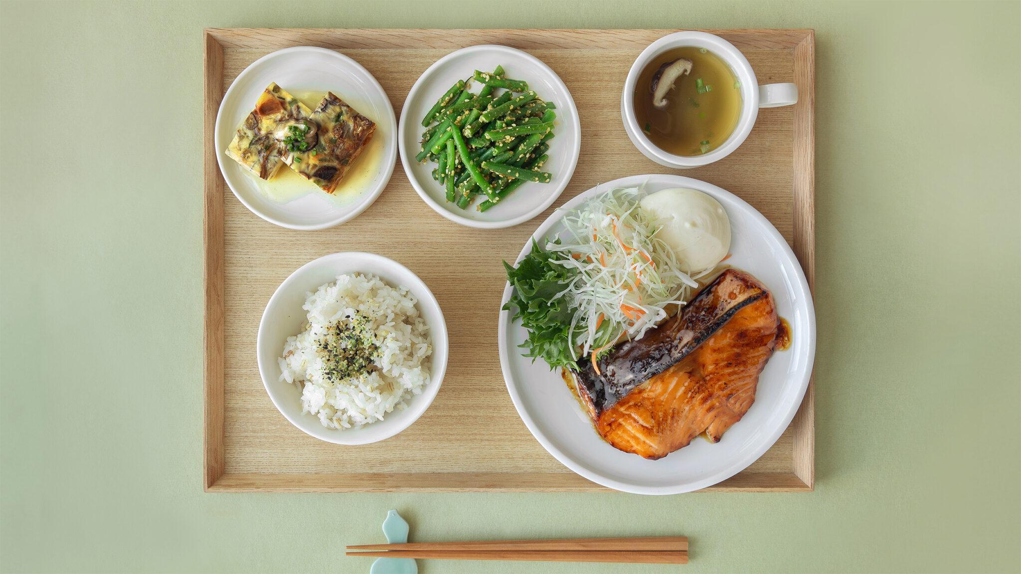 At MUJI Restaurant, you can enjoy lunch, take a coffee break with specialty coffees and freshly baked sweets, or choose something from the deli display—such as Japanese sando sandwiches. Lunch is served on weekdays from 11:00 to 15:00. Ichijyu-Sansai 一汁三菜 is a traditional Japanese way of serving a balanced and nutritious meal. The meal includes steamed Haenuki rice, soup, and three dishes (one main and two rotating sides).