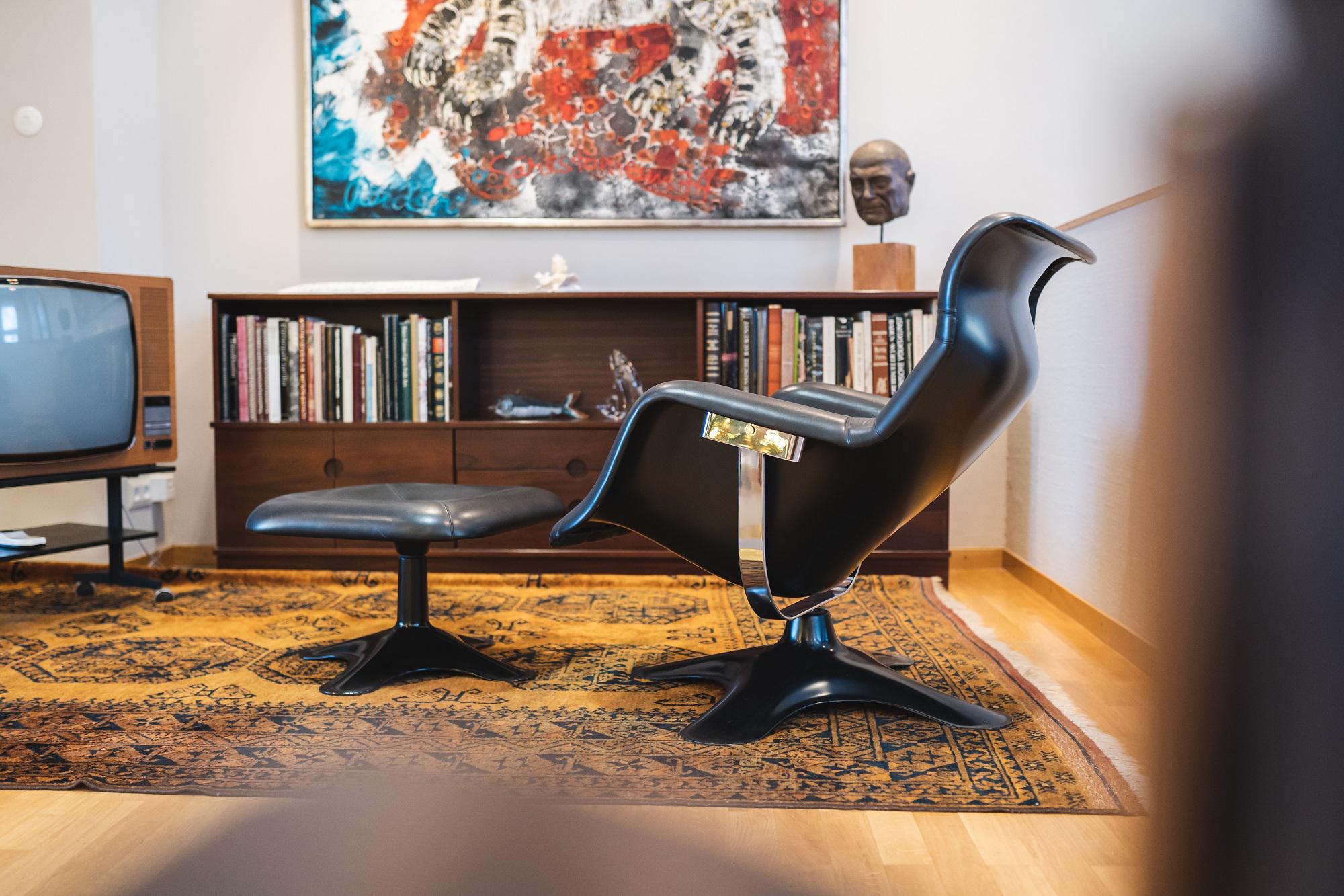 FI: Tamminiemen TV-nurkkaus. Kuvassa presidentti Kekkosen lempituoli, Yrjö Kukkapuron suunnittelema Karuselli.