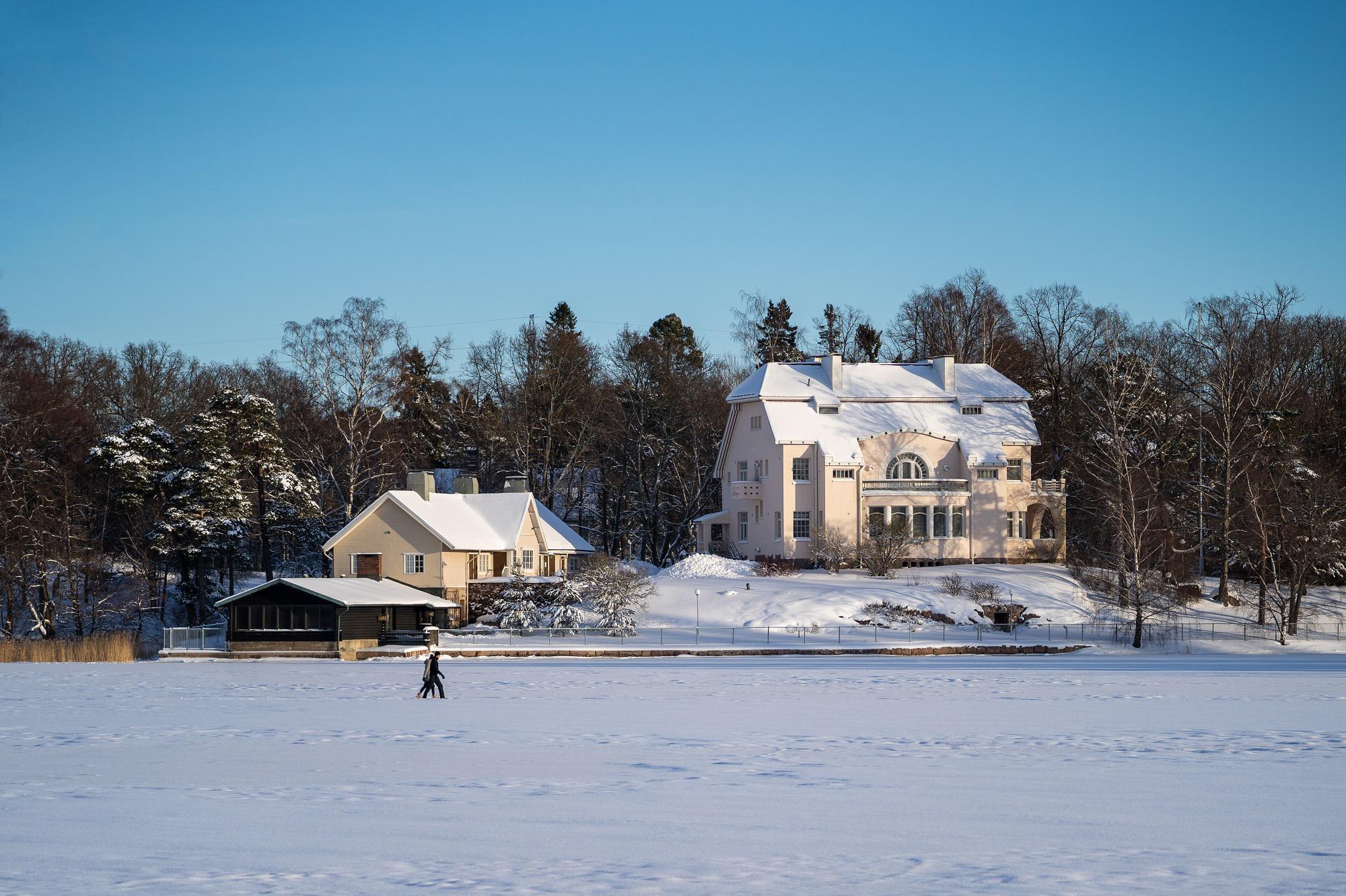 EN: Tamminiemi in winter. In front of the white building, the frozen sea can be seen.