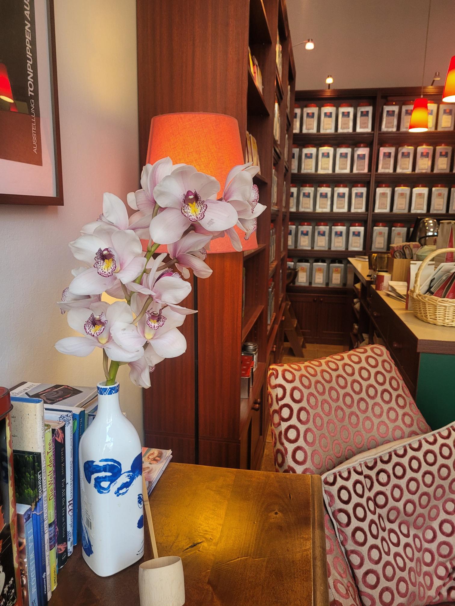 SV: Demmers Teehaus interiör. På bordet står en blomvas, och i bakgrunden syns en orangefärgad lampa.