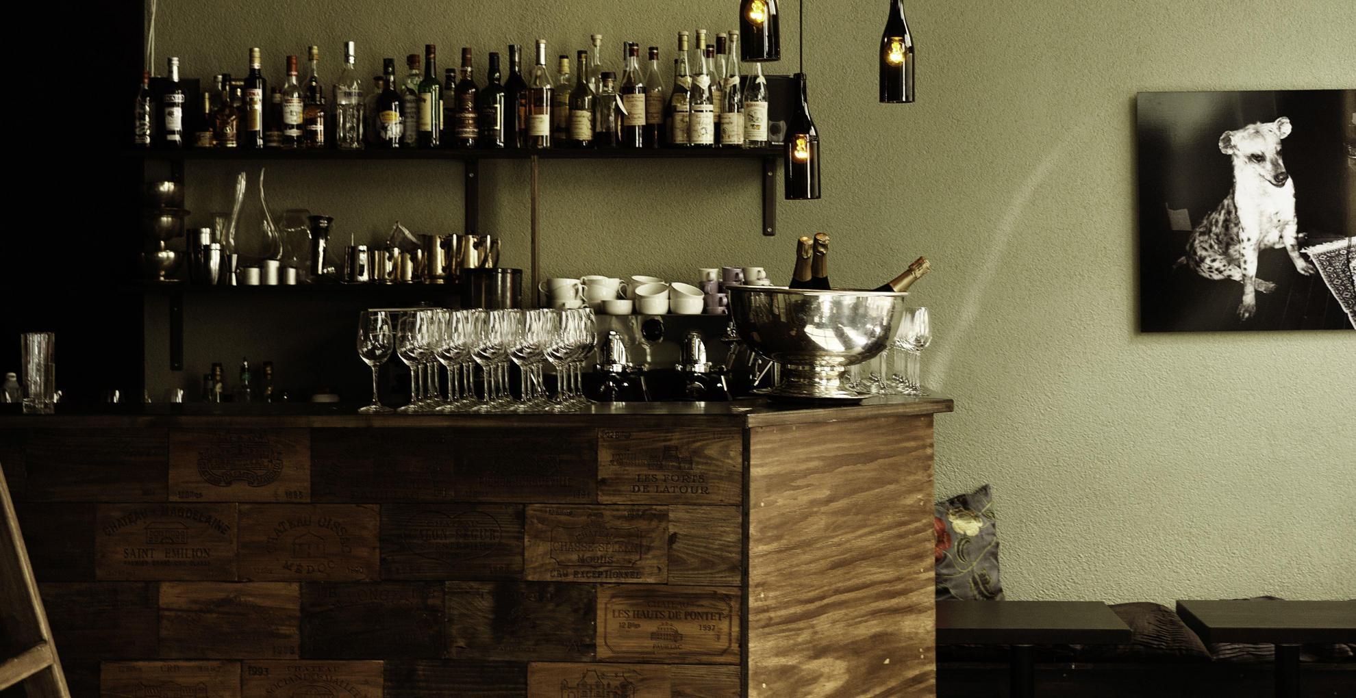 EN: Restaurant Muru's interior. A counter on top of which there glasses, and in the background a shelf with bottles.