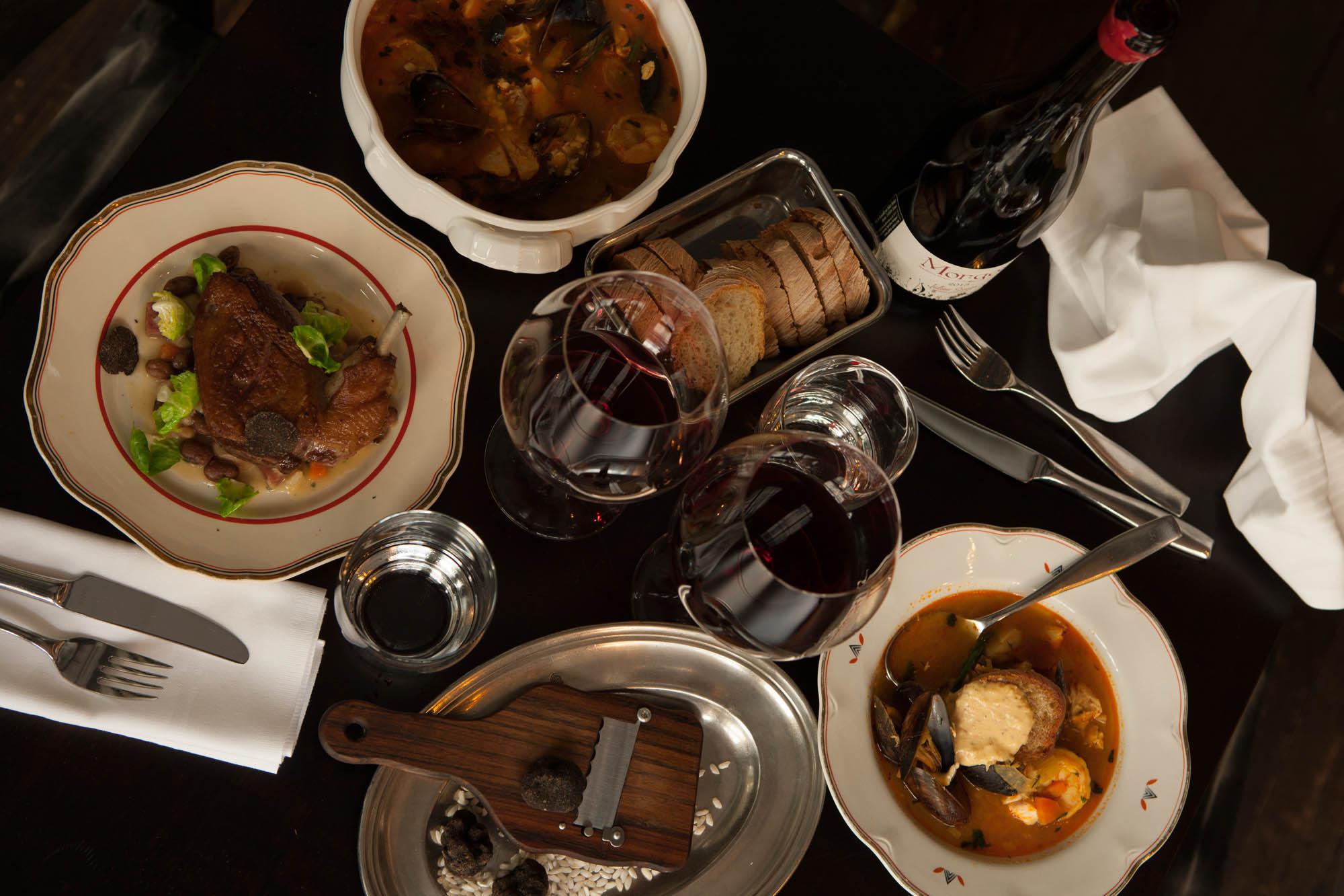 SV: Restaurang Murus maträtter och drycker på bordet.