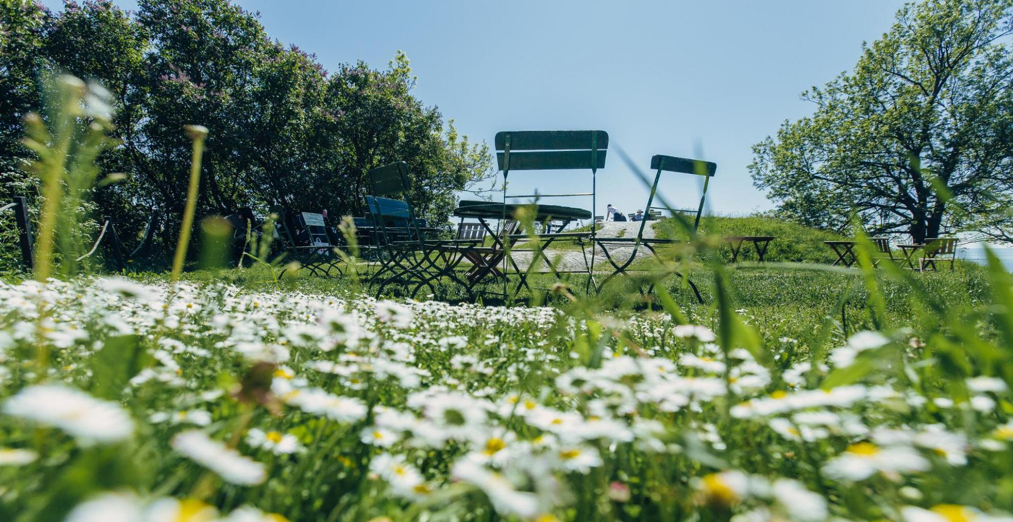 SV: Gräsmatta med vita blommor. I bakgrunden syns bord och stolar.
