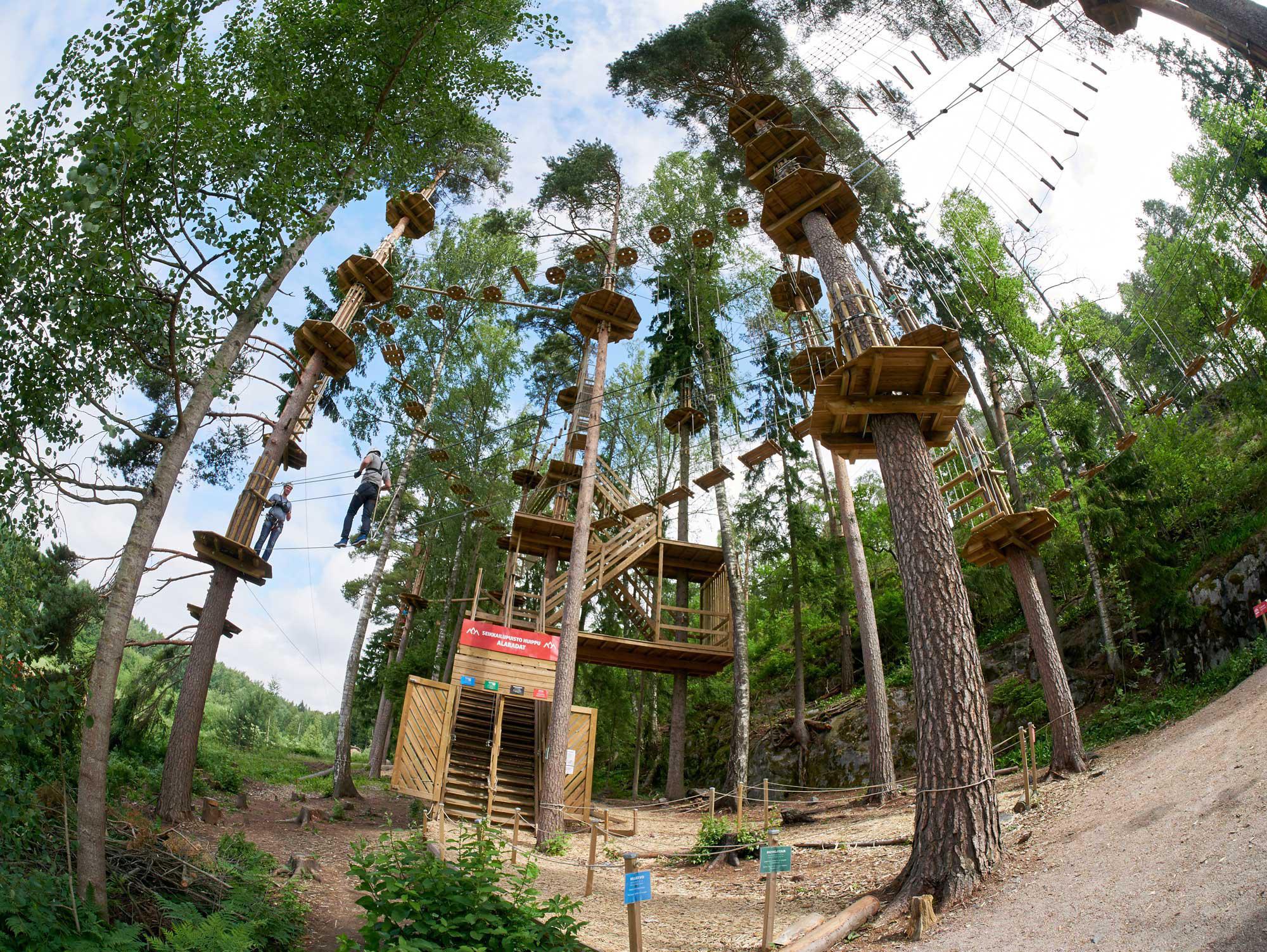 SV: Äventyr, adrenalin och andlös spänning! Klättra, kryp, balansera och sväva runt i denna äventyrspark med sammanlagt åtta banor.