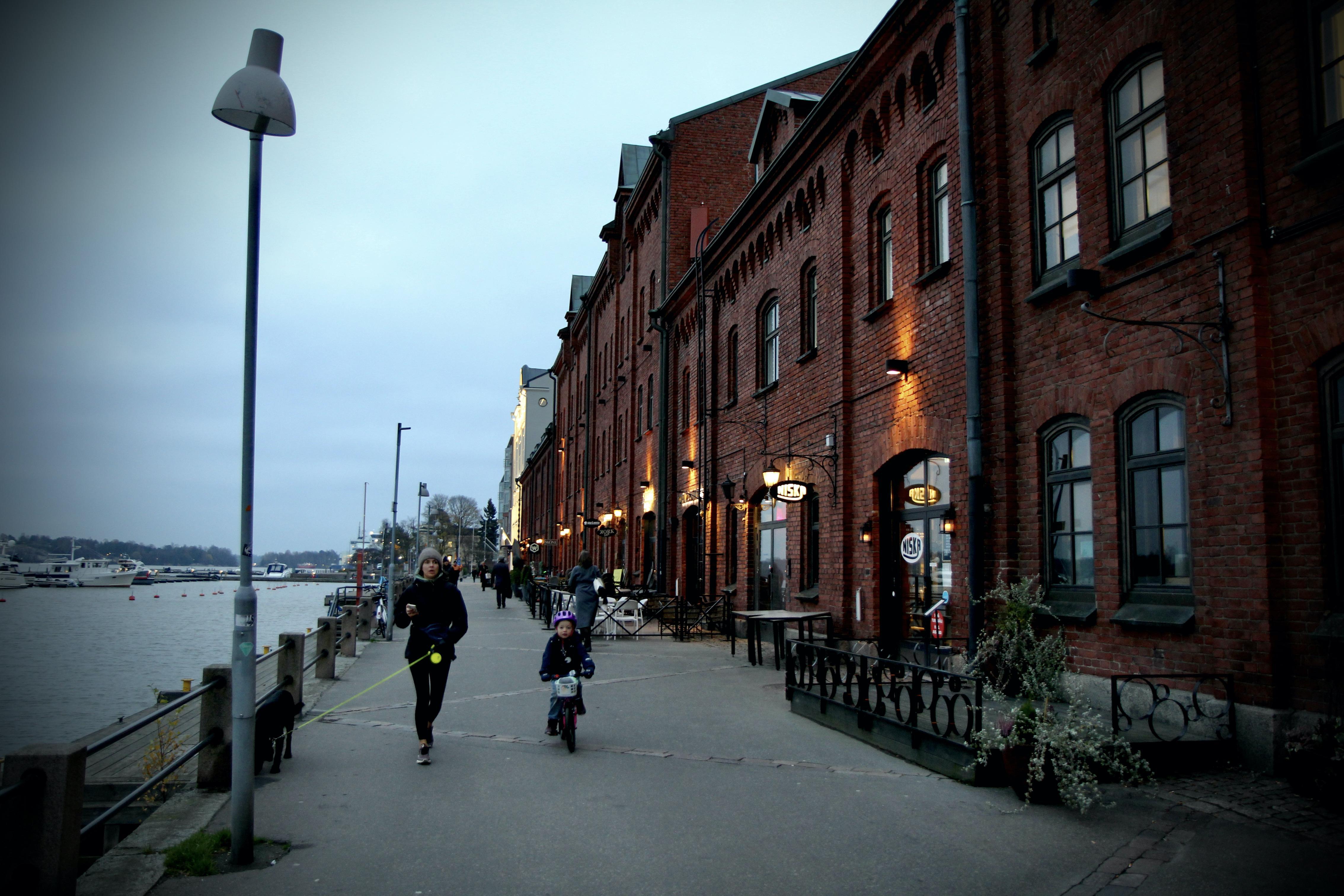 FI: Niska Helsingin edusta, kaksi ihmistä kadulla ravintolan edessä.