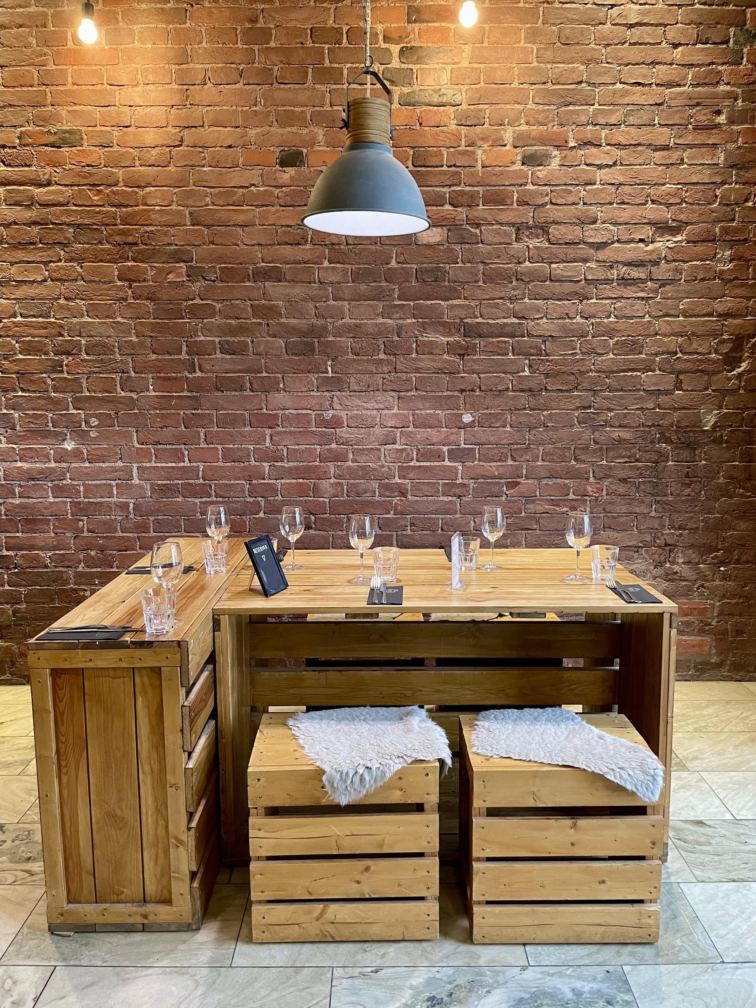 EN: The dining area inside Niska Helsinki, a table in front of the old brick wall.