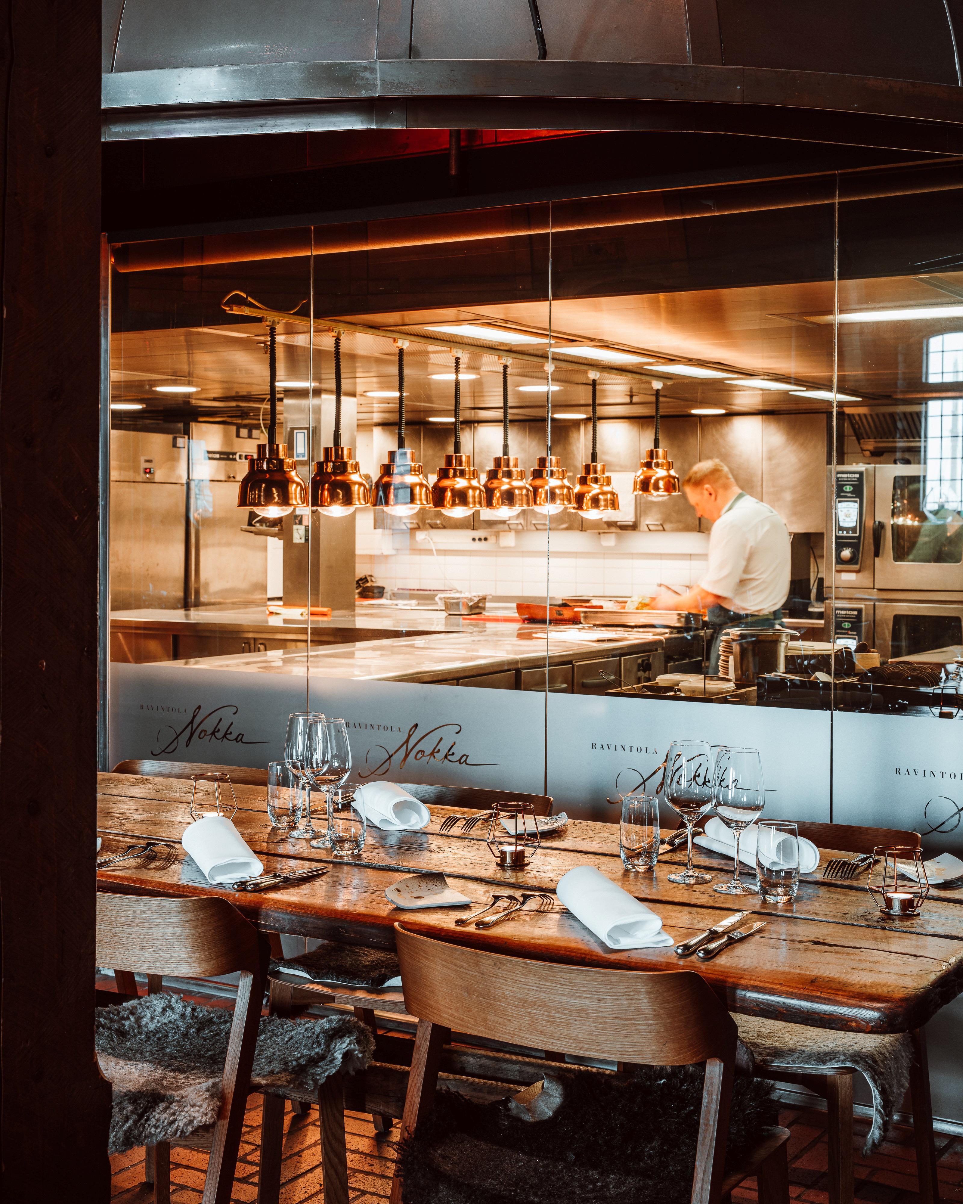 FI: Ravintola Nokan sisätilat. Katettuja pöytiä, ja taustalla ravintolan keittiö jossa näkyy kokki.