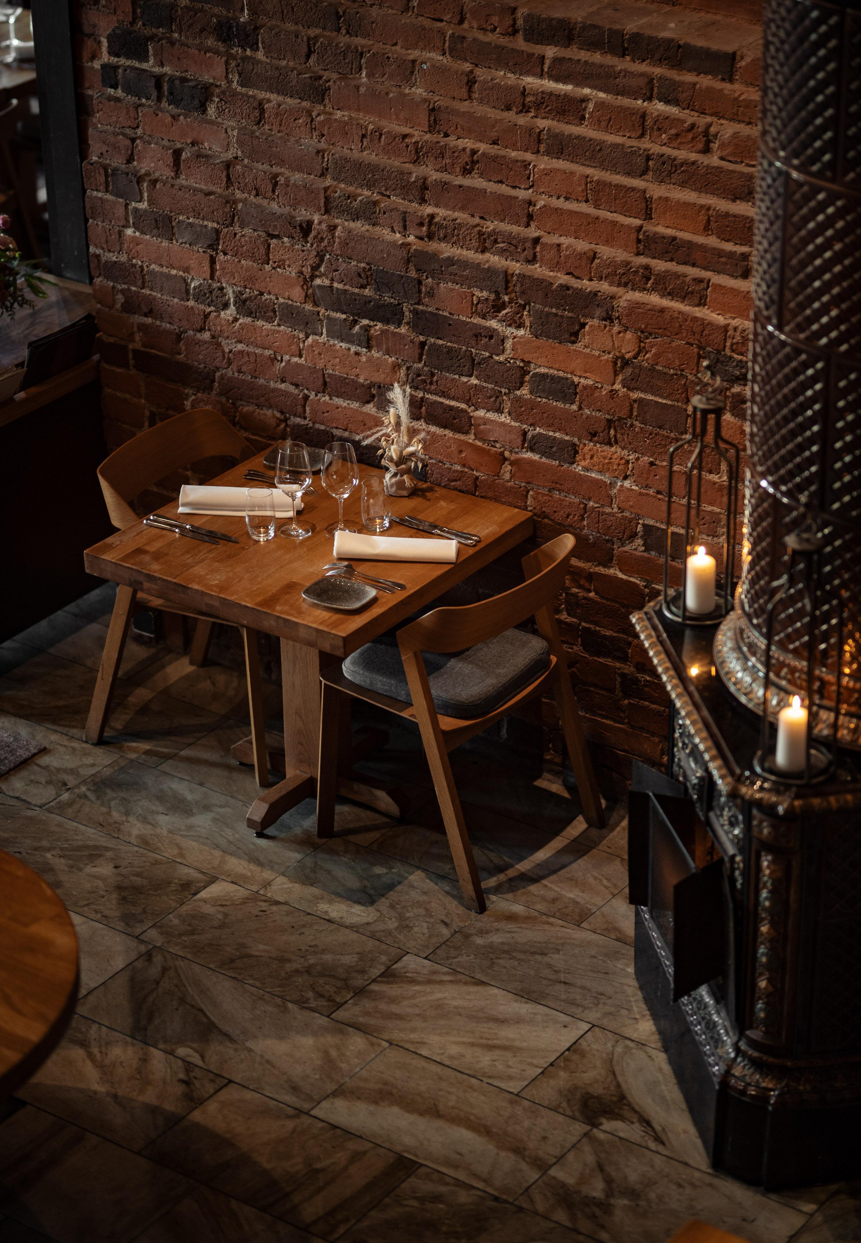 EN: Restaurant Nokka's interior. A table next to a red brick wall.