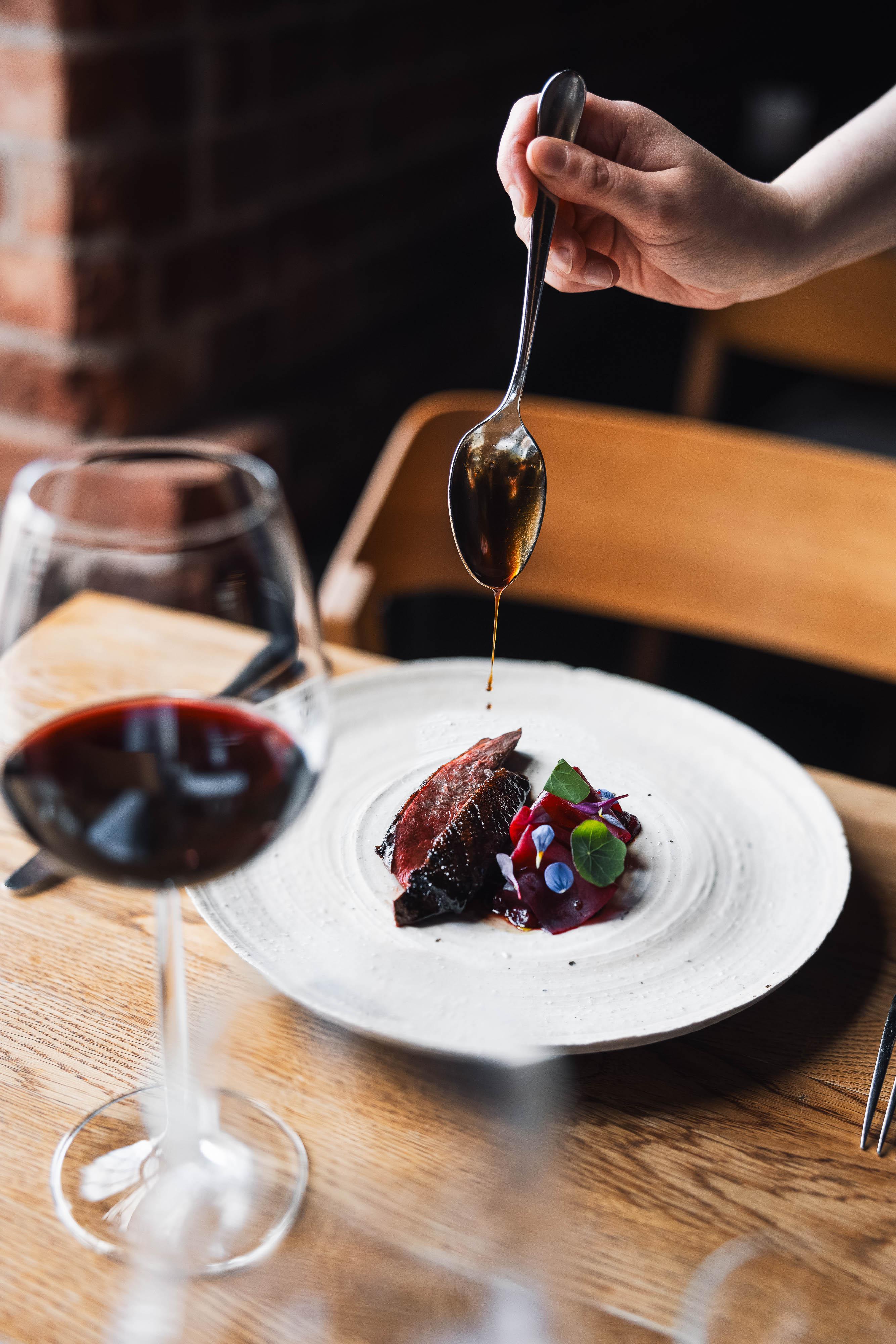 FI: Ravintola Nokan sisätilat. Pöydällä on ruoka-annos ja viinilasi.