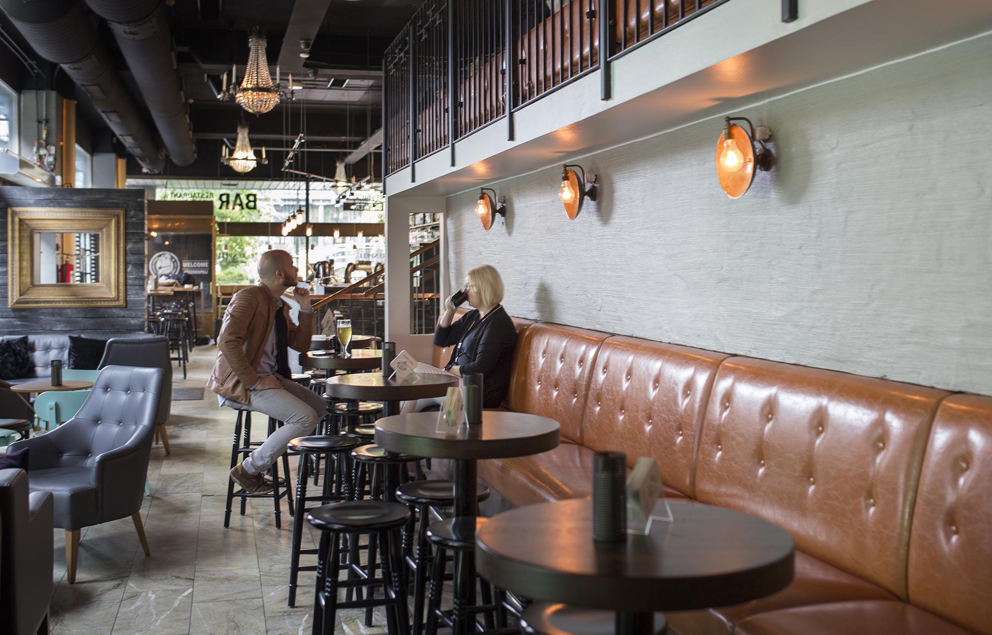FI: Teerenpeli Kampin sisätilat. Baaritiski, jonka edessä istuu kaksi ihmistä.